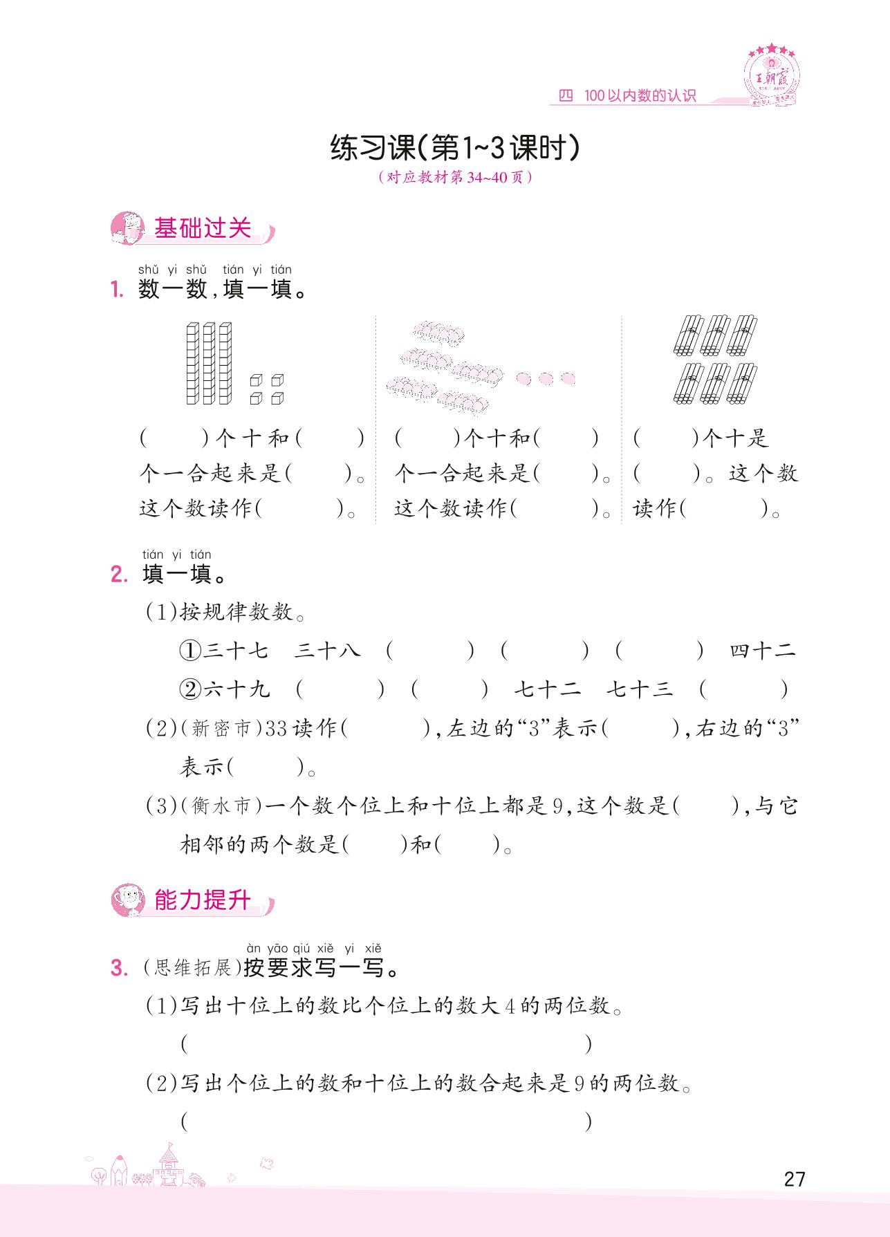 2022下册一年级数学人教版 四 100以内数的认识——练习课(第1~3课时)
