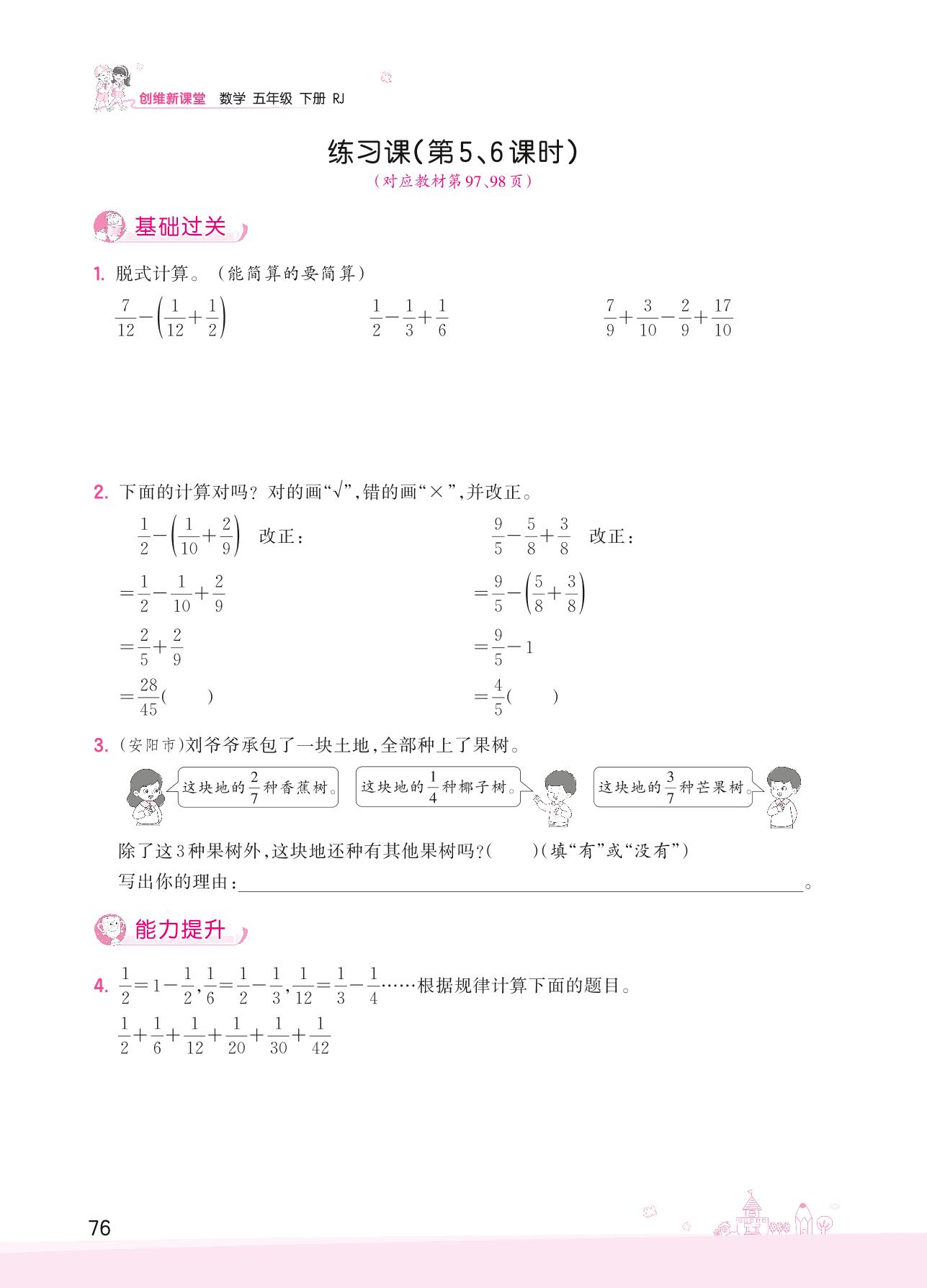 2022下册五年级数学人教版 六 分数的加法和减法——练习课(第5、6课时)