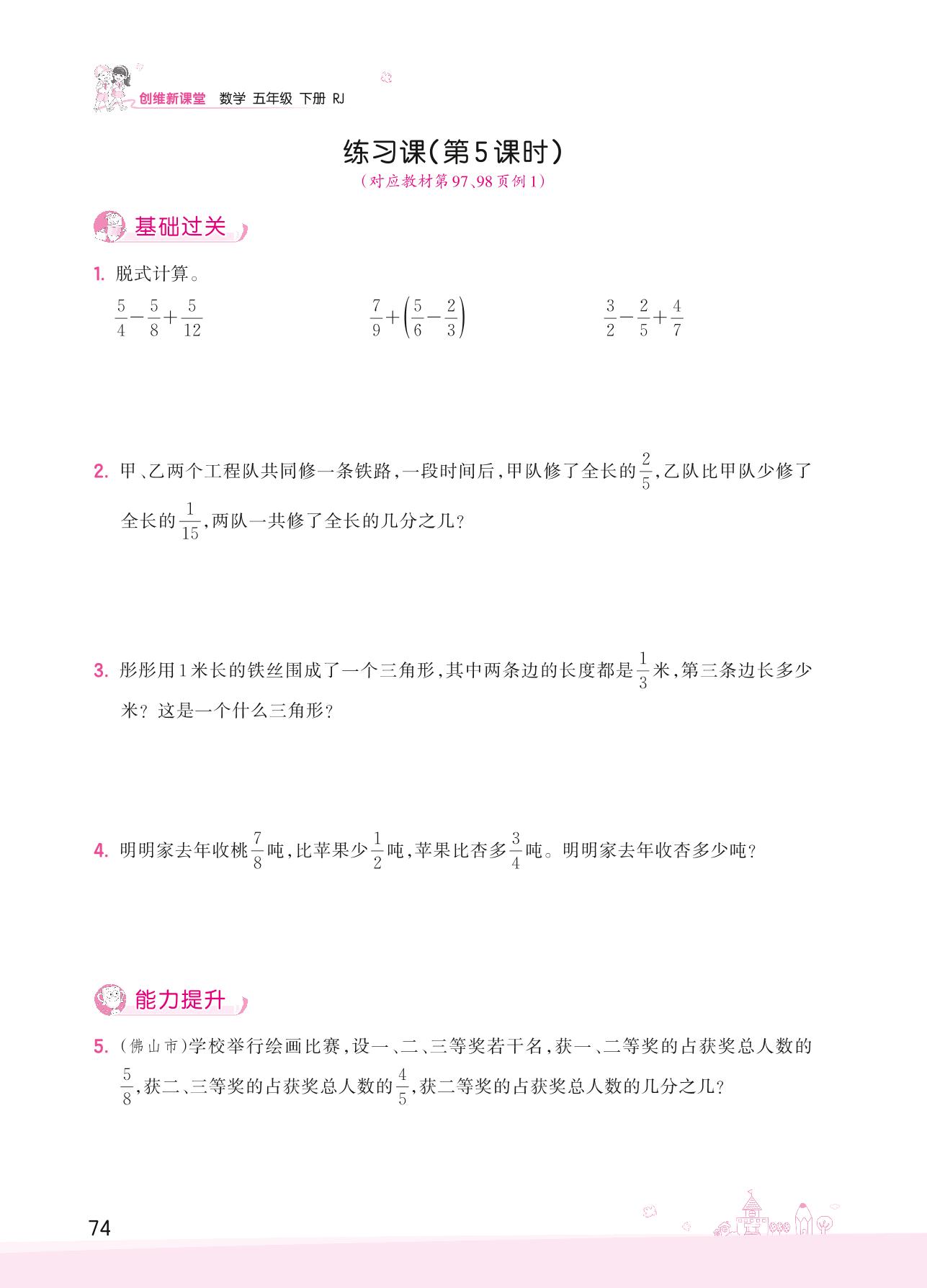 2022下册五年级数学人教版 六 分数的加法和减法——练习课(第5课时)