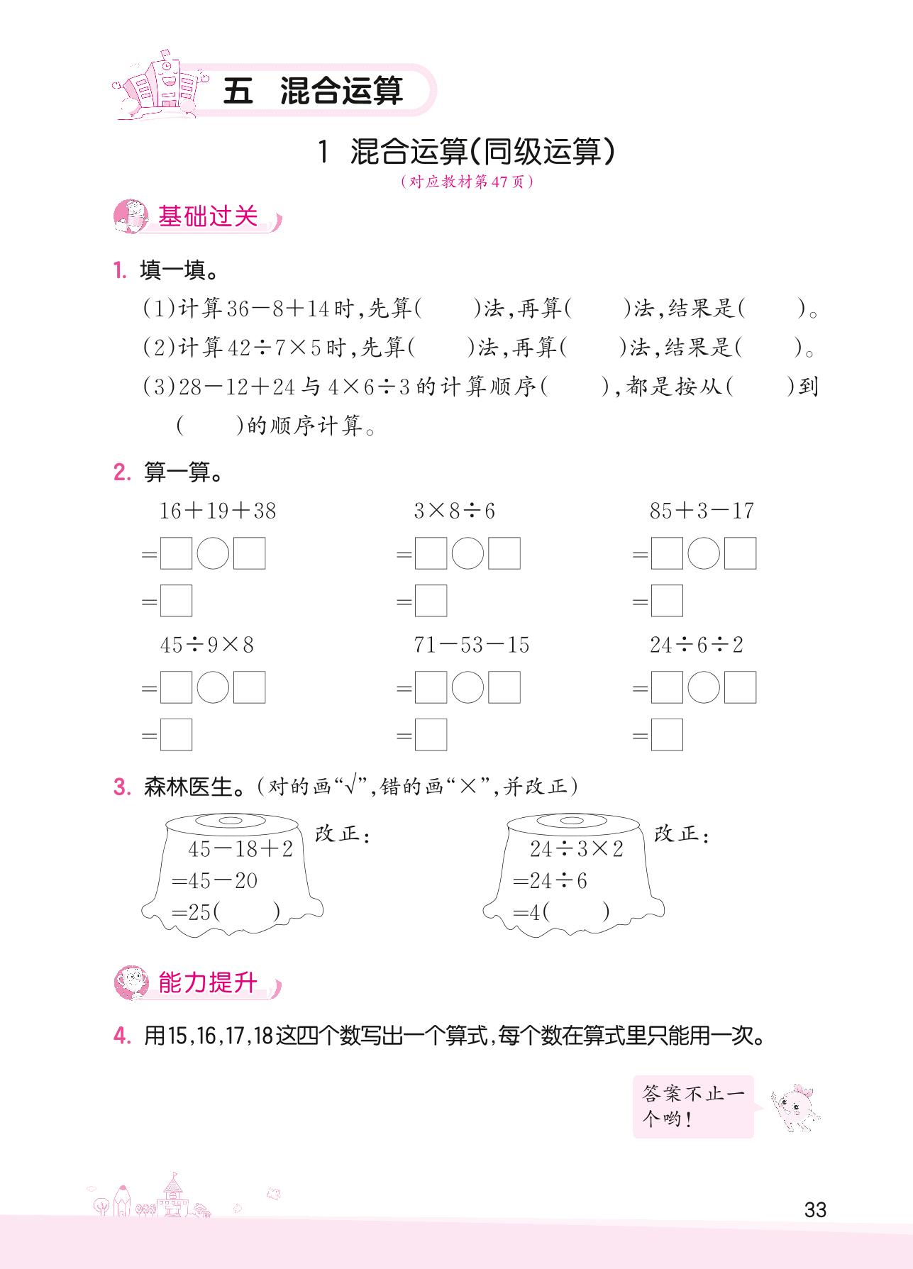 2022下册二年级数学人教版 五 混合运算——1 混合运算(同级运算)