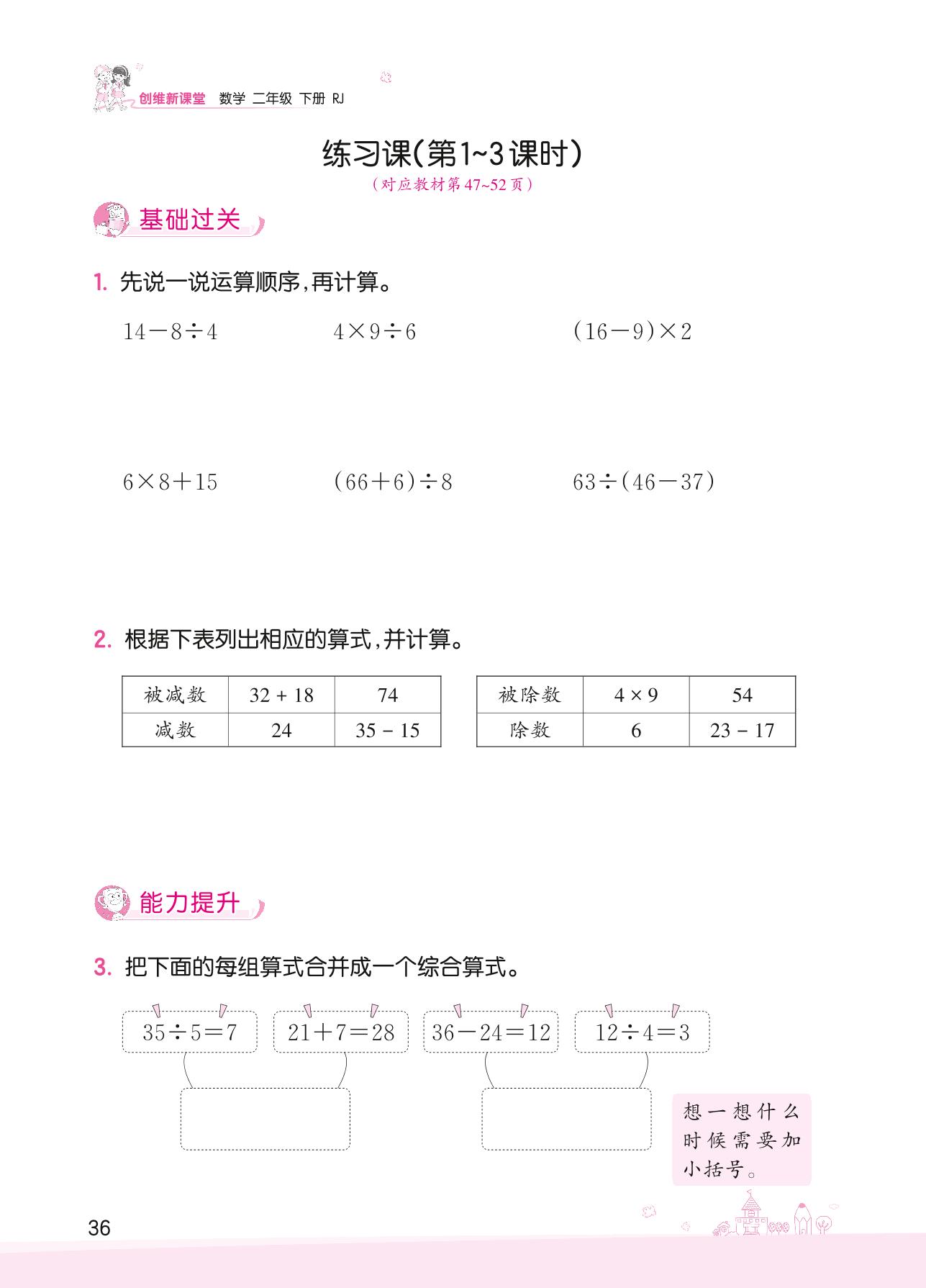 2022下册二年级数学人教版 五 混合运算——练习课(第1~3课时)