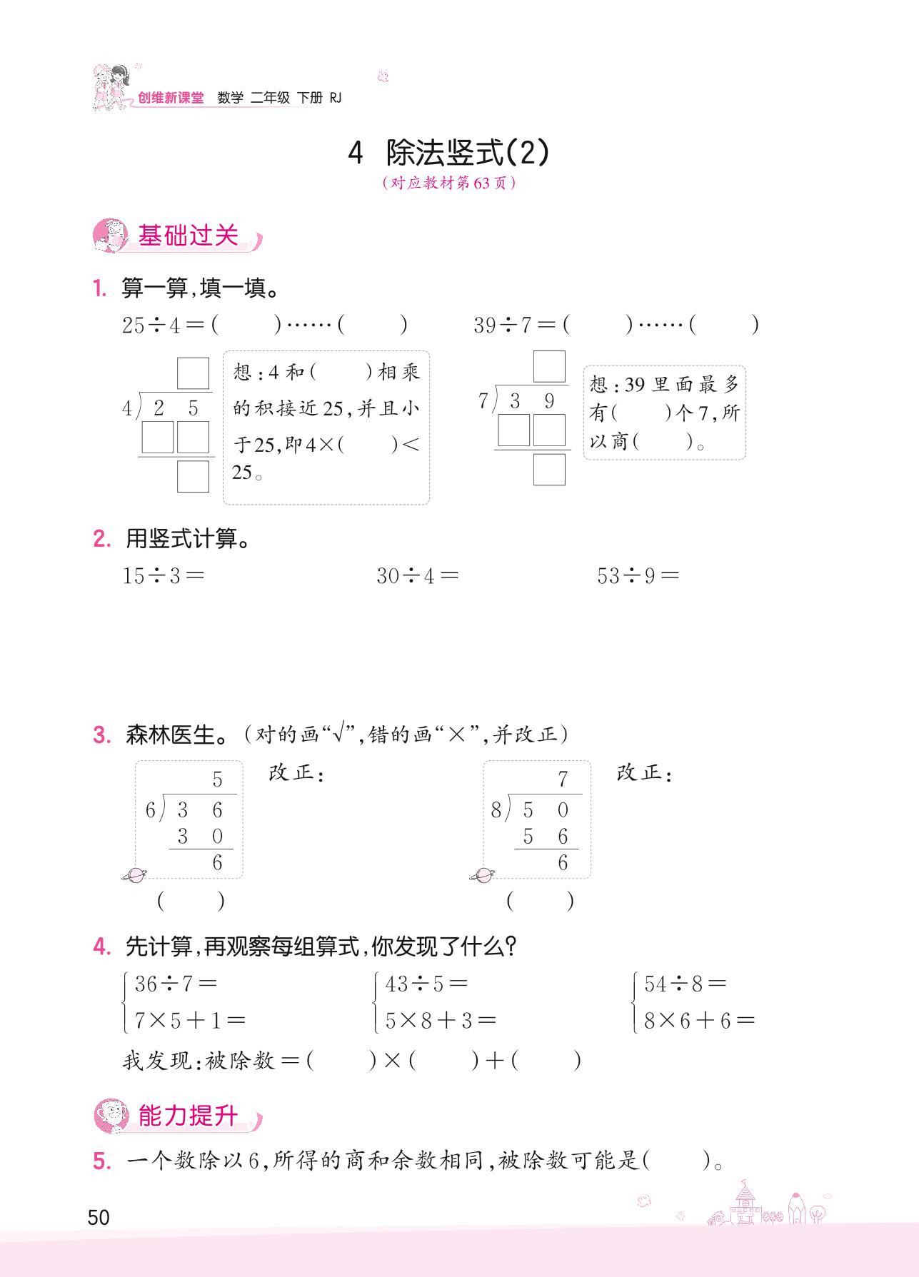 2022下册二年级数学人教版 六 有余数的除法——4 除法竖式(2)