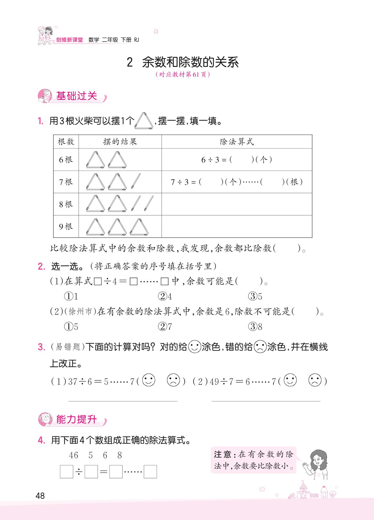2022下册二年级数学人教版 六 有余数的除法——2 余数和除数的关系