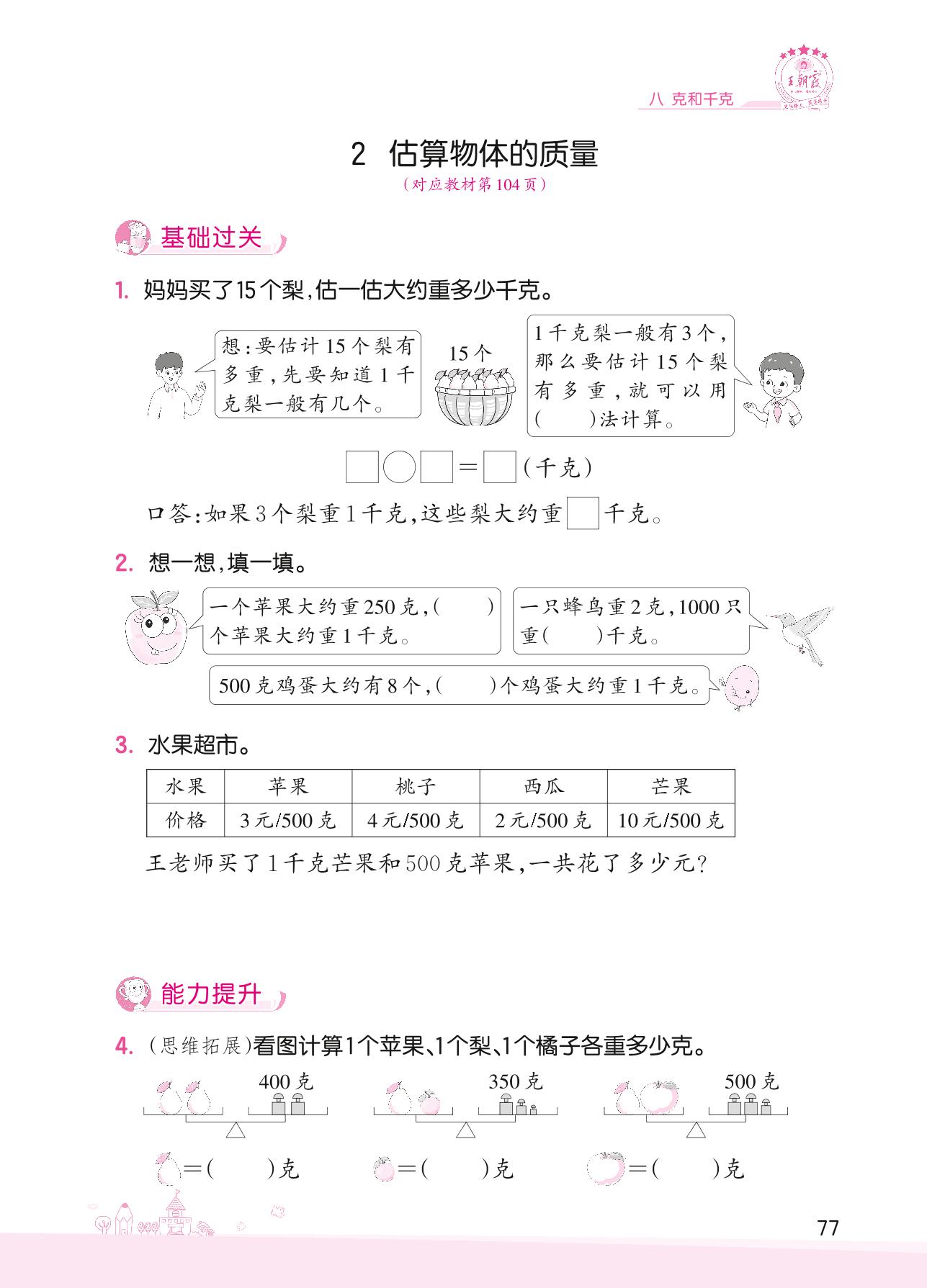 2022下册二年级数学人教版 八 克和千克——2 估算物体的质量