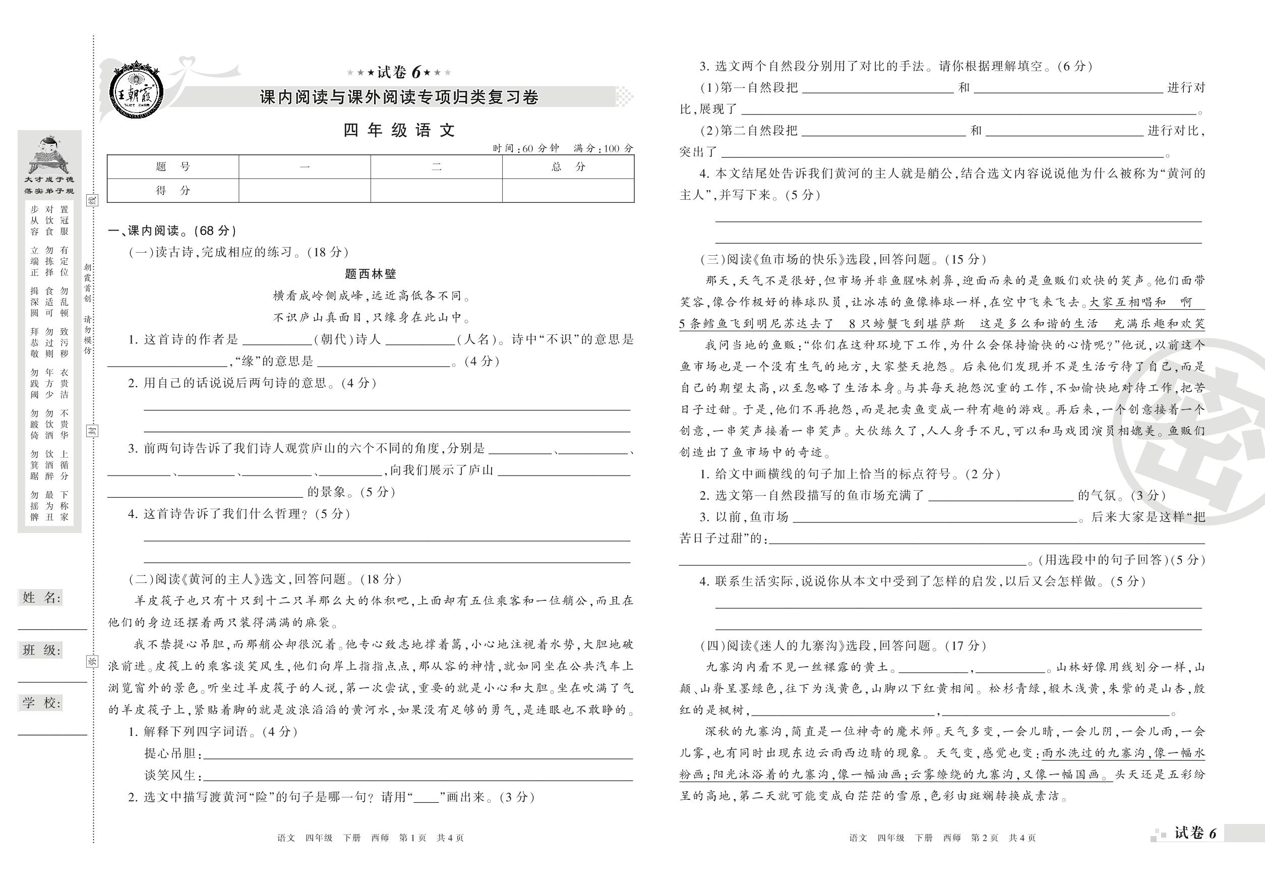 王朝霞期末专项卷——课内阅读与课外阅读专项归类复习卷四年级下册语文(西师版)_R210801225301【6】