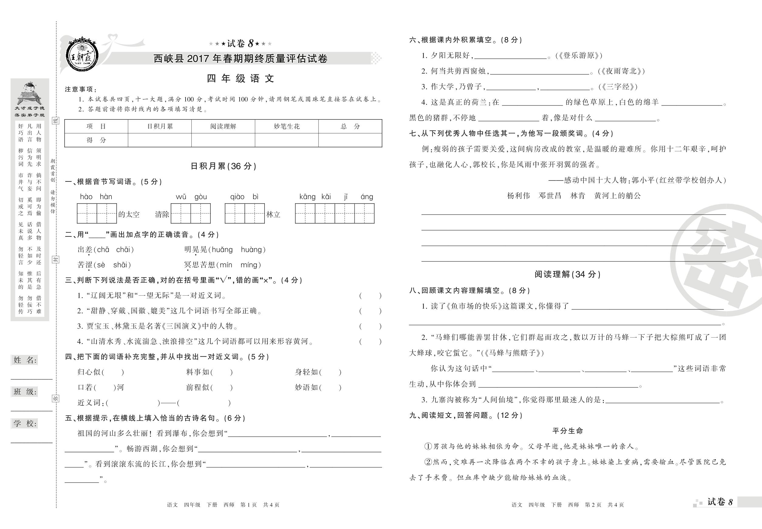 2016-2017学年第二学期南阳市西峡县四年级语文试卷(西师版)【8】