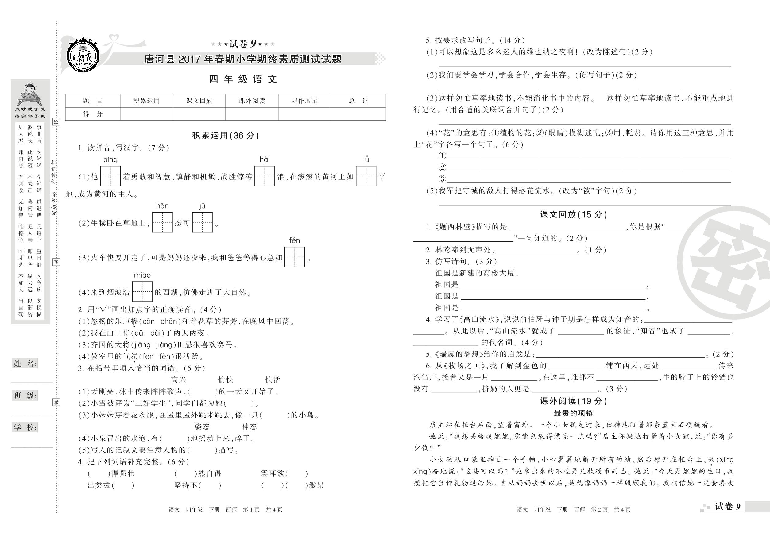 2016-2017学年第二学期南阳市唐河县四年级语文试卷(西师版)【9】