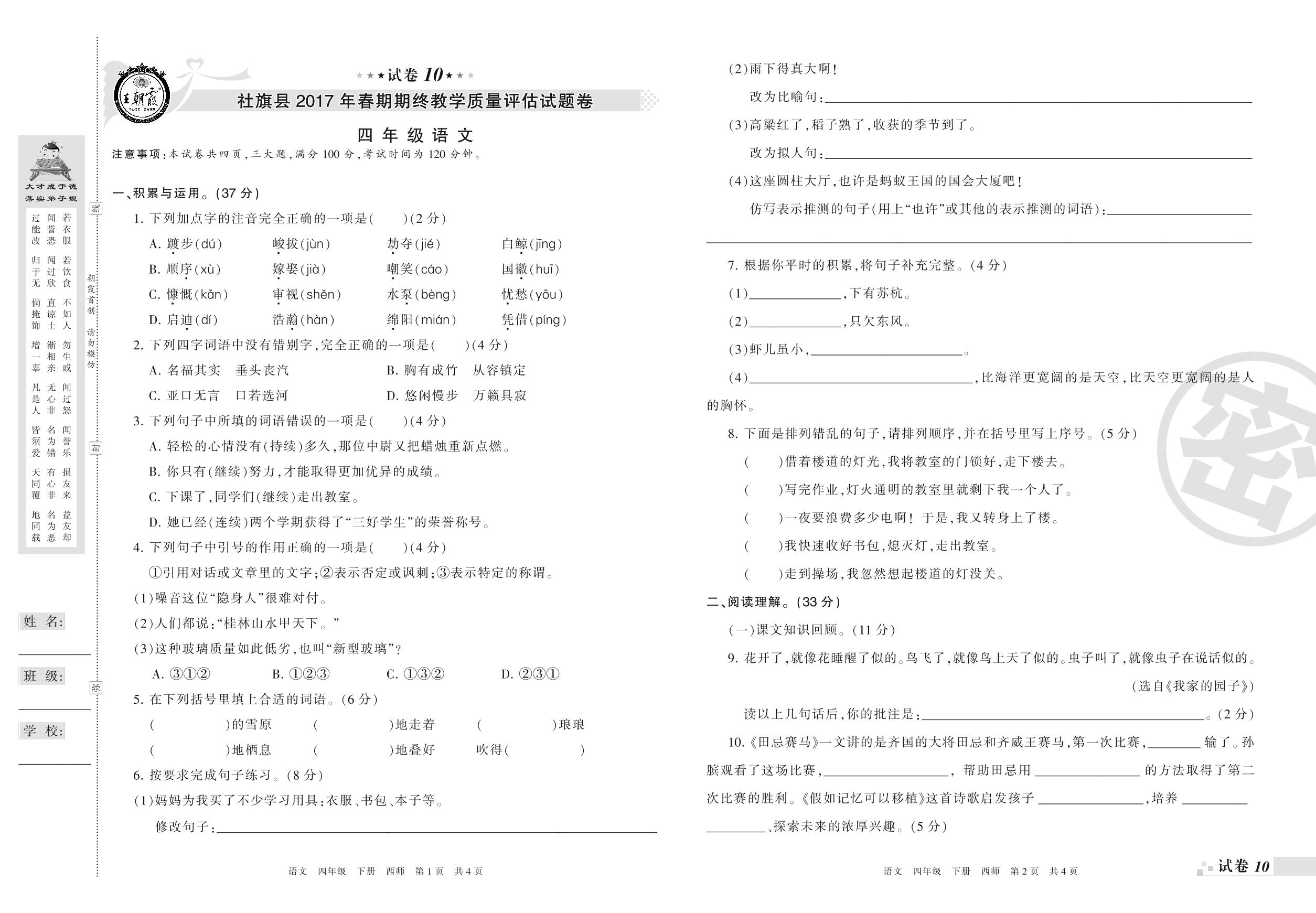2016-2017学年第二学期南阳市社旗县四年级语文试卷(西师版)【10】