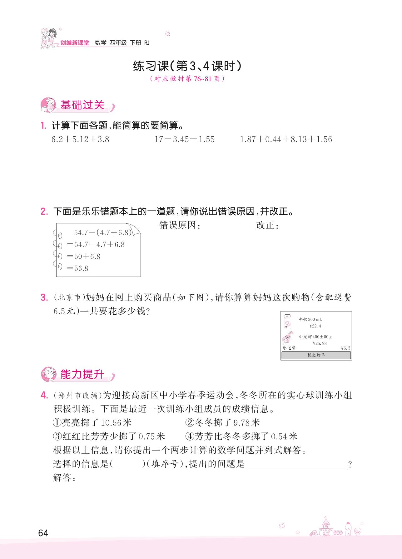 2022下册四年级数学人教版 六 小数的加法和减法——练习课(第3、4课时)
