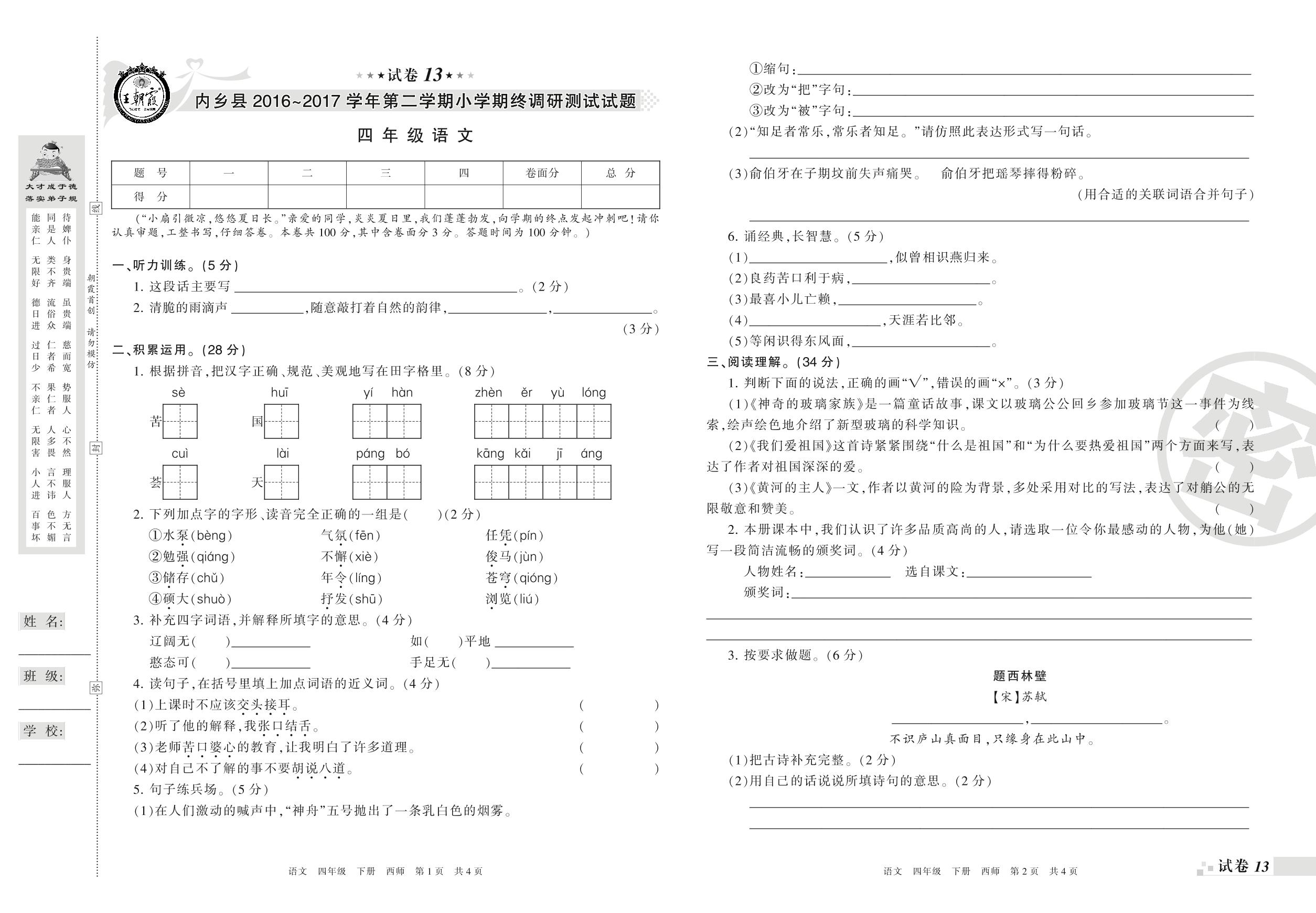 2016-2017学年第二学期南阳市内乡县四年级语文试卷(西师版)【13】
