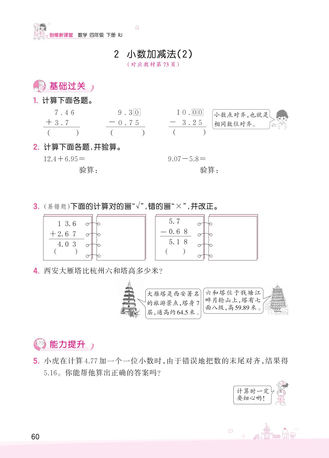 2022下册四年级数学人教版 六 小数的加法和减法——2 小数加减法(2)
