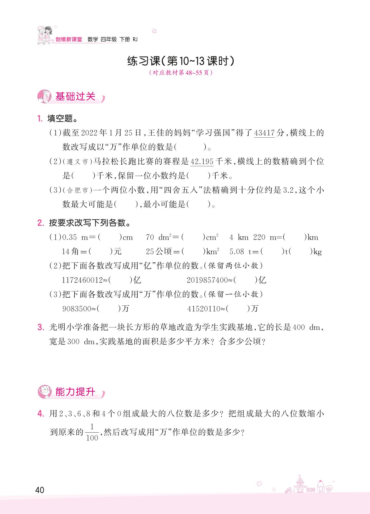 2022下册四年级数学人教版 四 小数的意义和性质——练习课(第10~13课时)