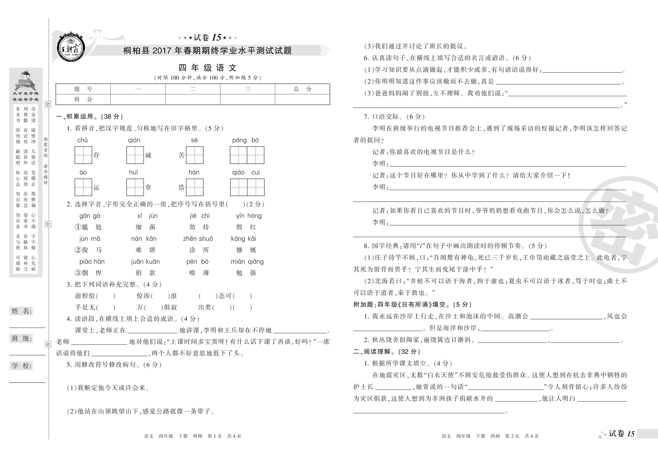 2016-2017学年第二学期南阳市桐柏县四年级语文试卷(西师版)【15】