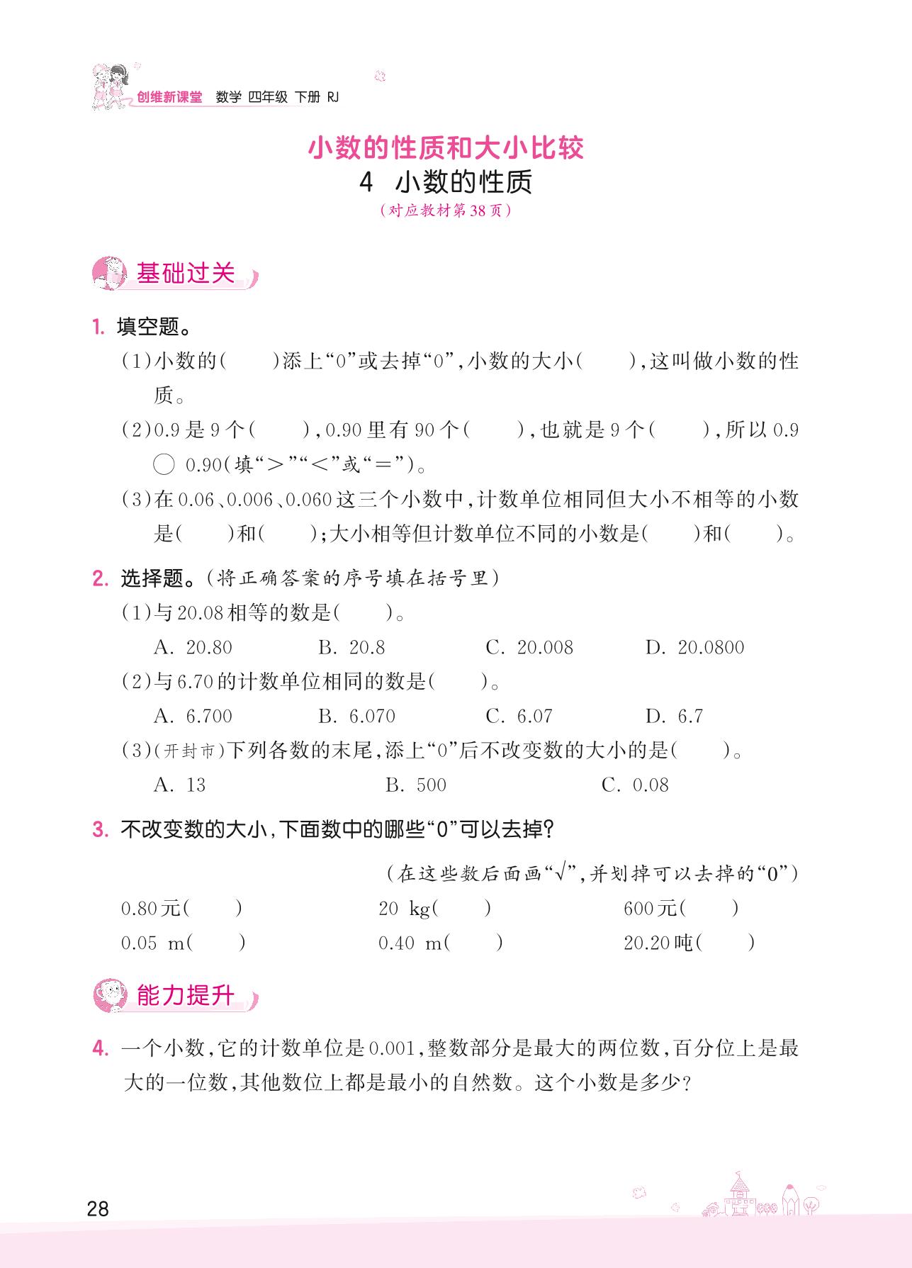 2022下册四年级数学人教版 四 小数的意义和性质——4 小数的性质