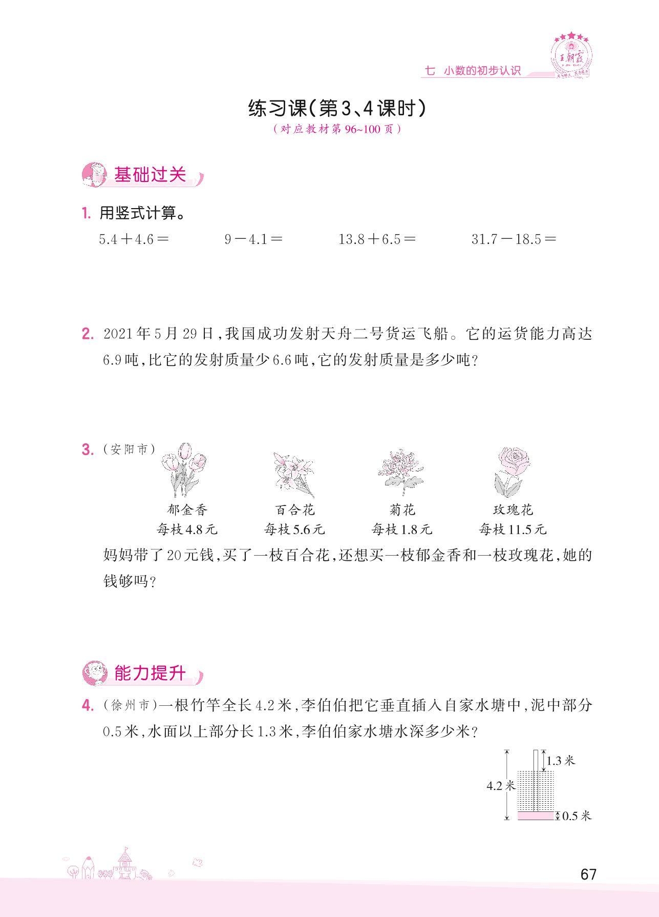 2022下册三年级数学人教版 七 小数的初步认识——练习课(第3、4课时)