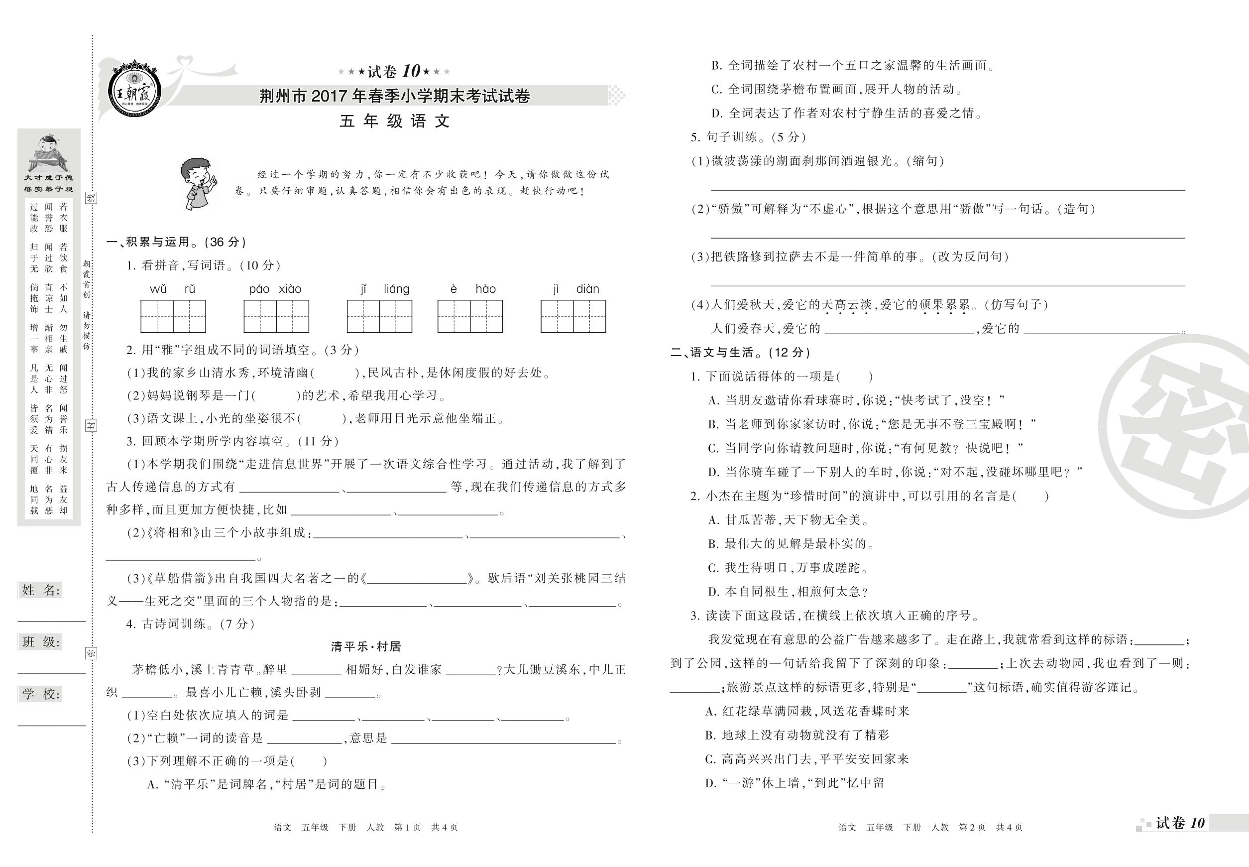 2016-2017学年第二学期荆州市五年级语文试卷(人教版)【10】