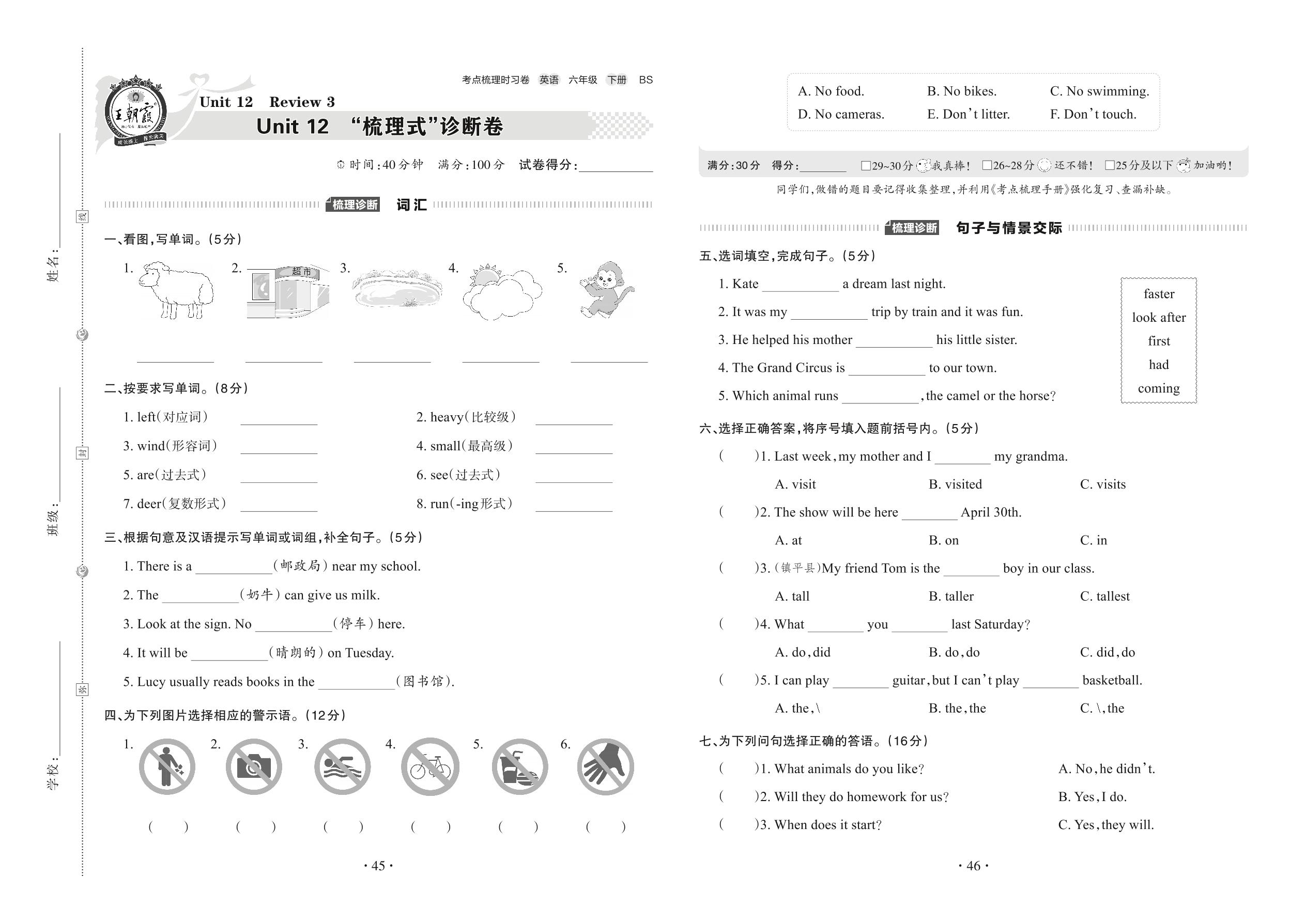 2022下册六年级英语北师版 Unit 12 “梳理式”诊断卷