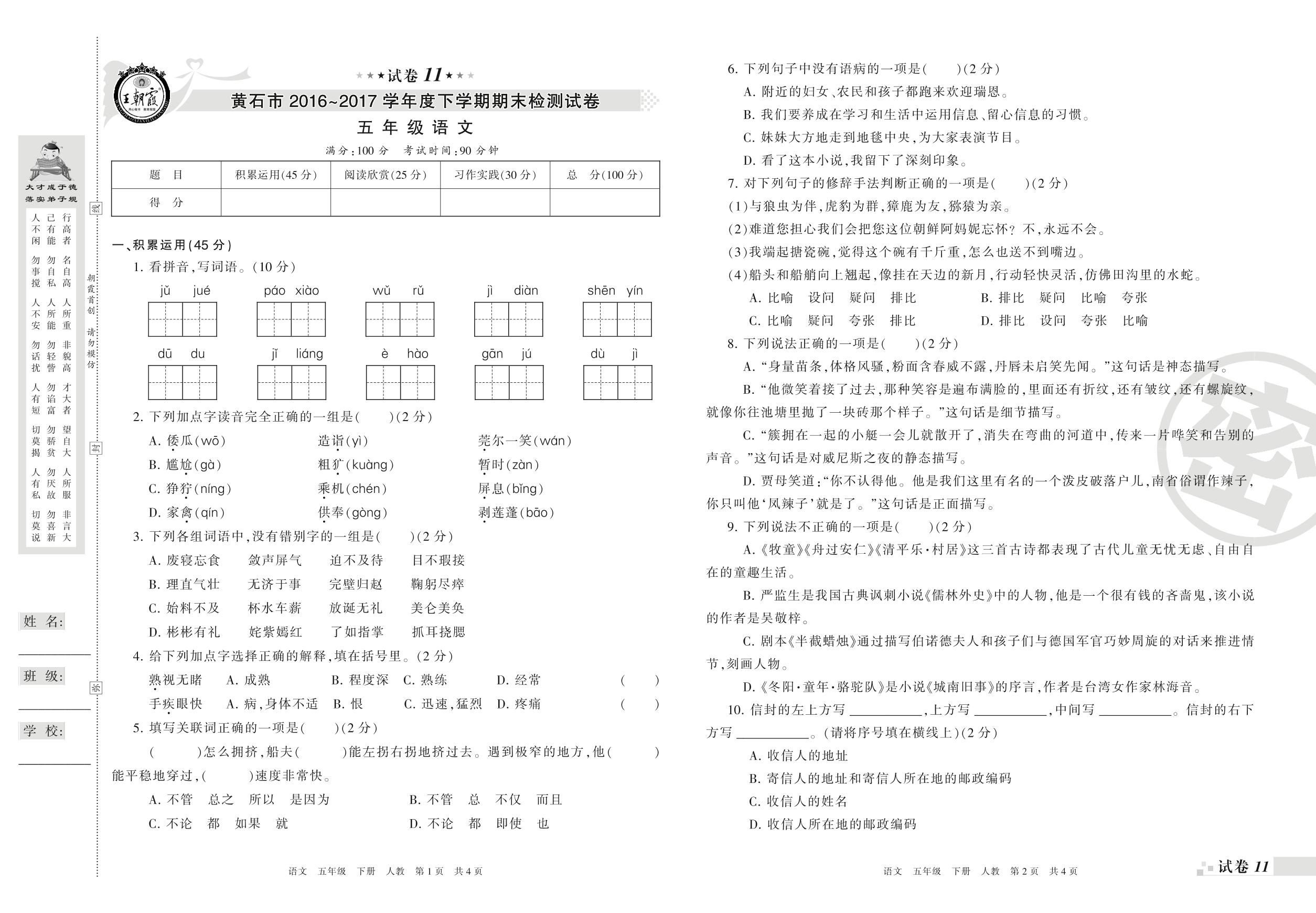 2016-2017学年第二学期黄石市五年级语文试卷(人教版)【11】