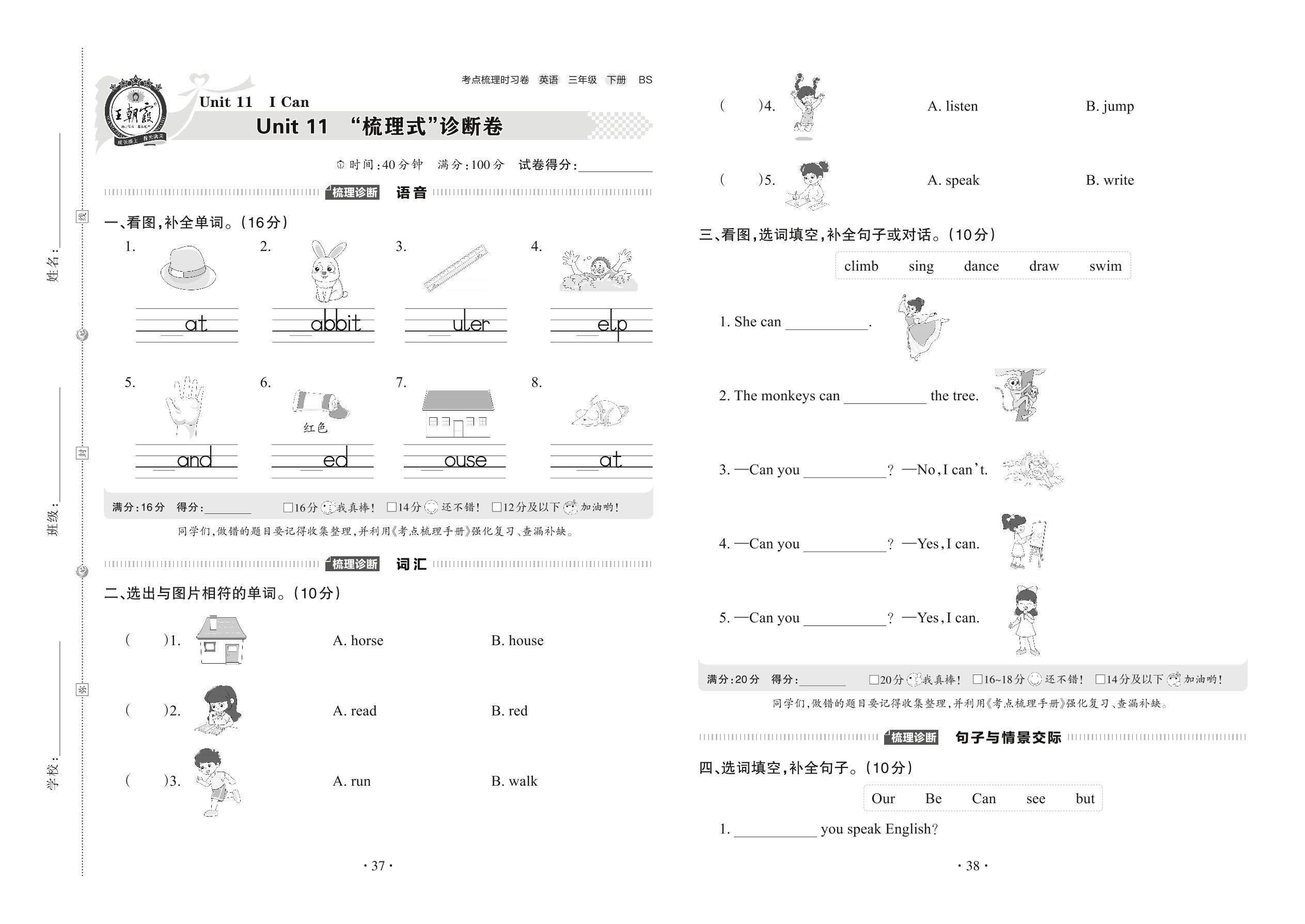 2022下册三年级英语北师版 Unit 11 “梳理式”诊断卷