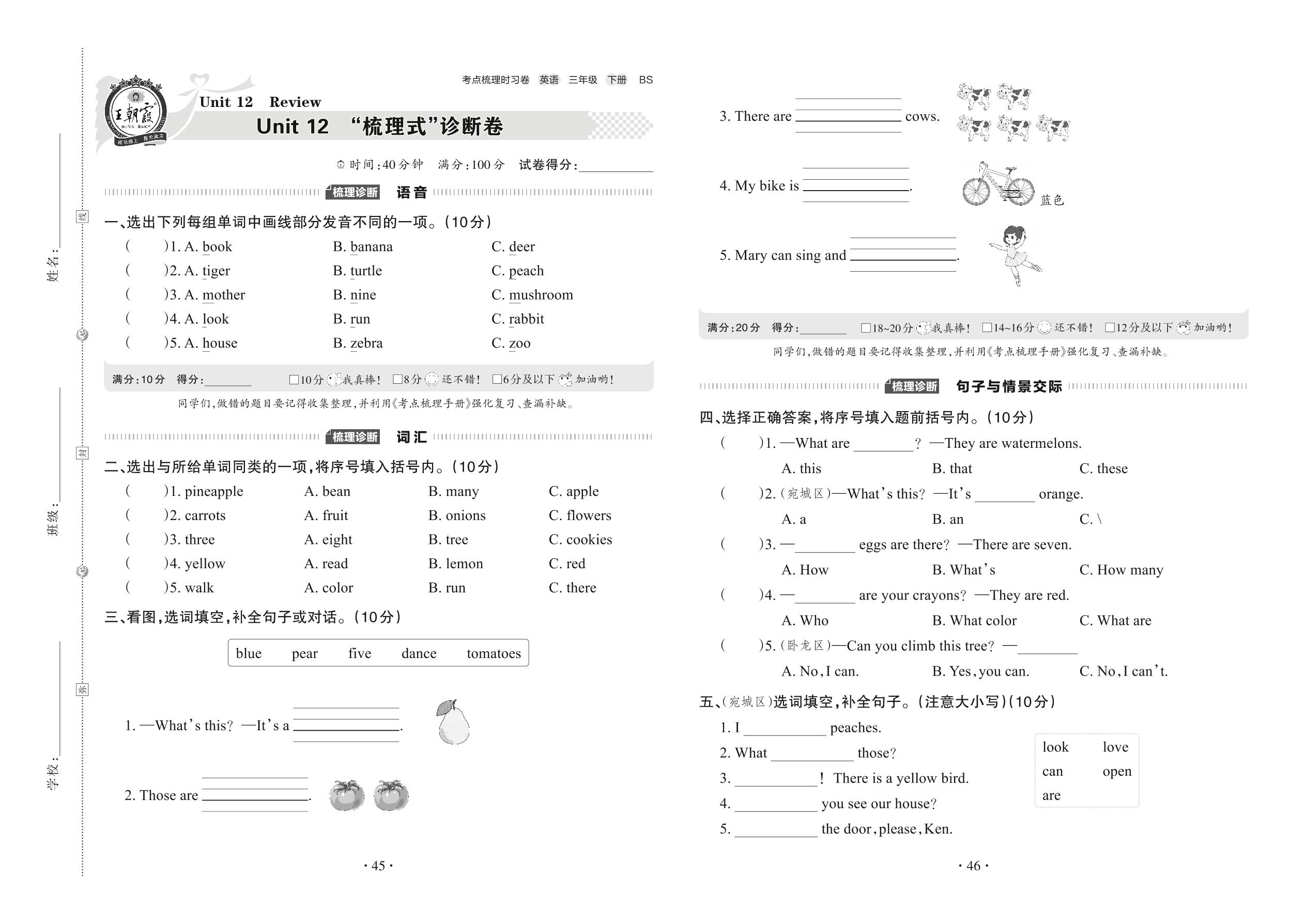 2022下册三年级英语北师版 Unit 12 “梳理式”诊断卷