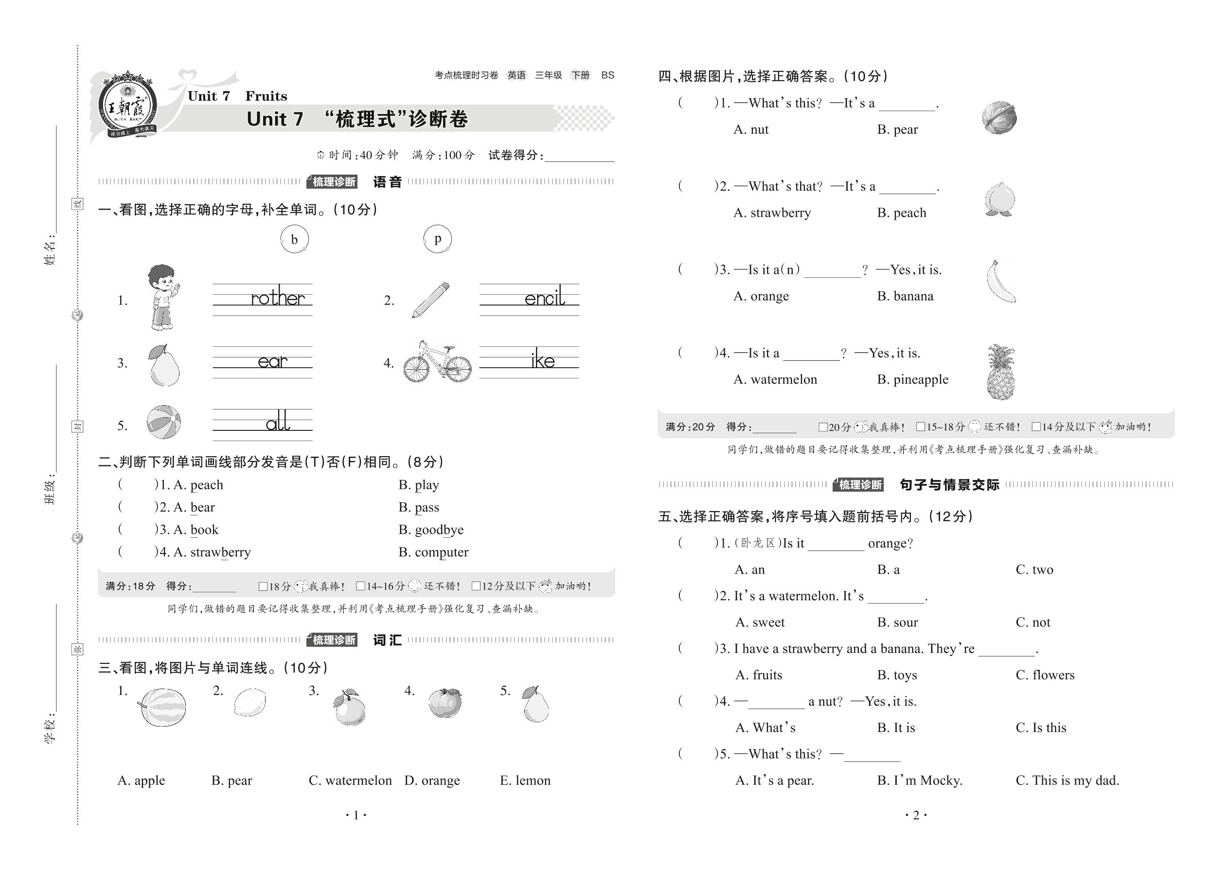 2022下册三年级英语北师版 Unit 7 “梳理式”诊断卷