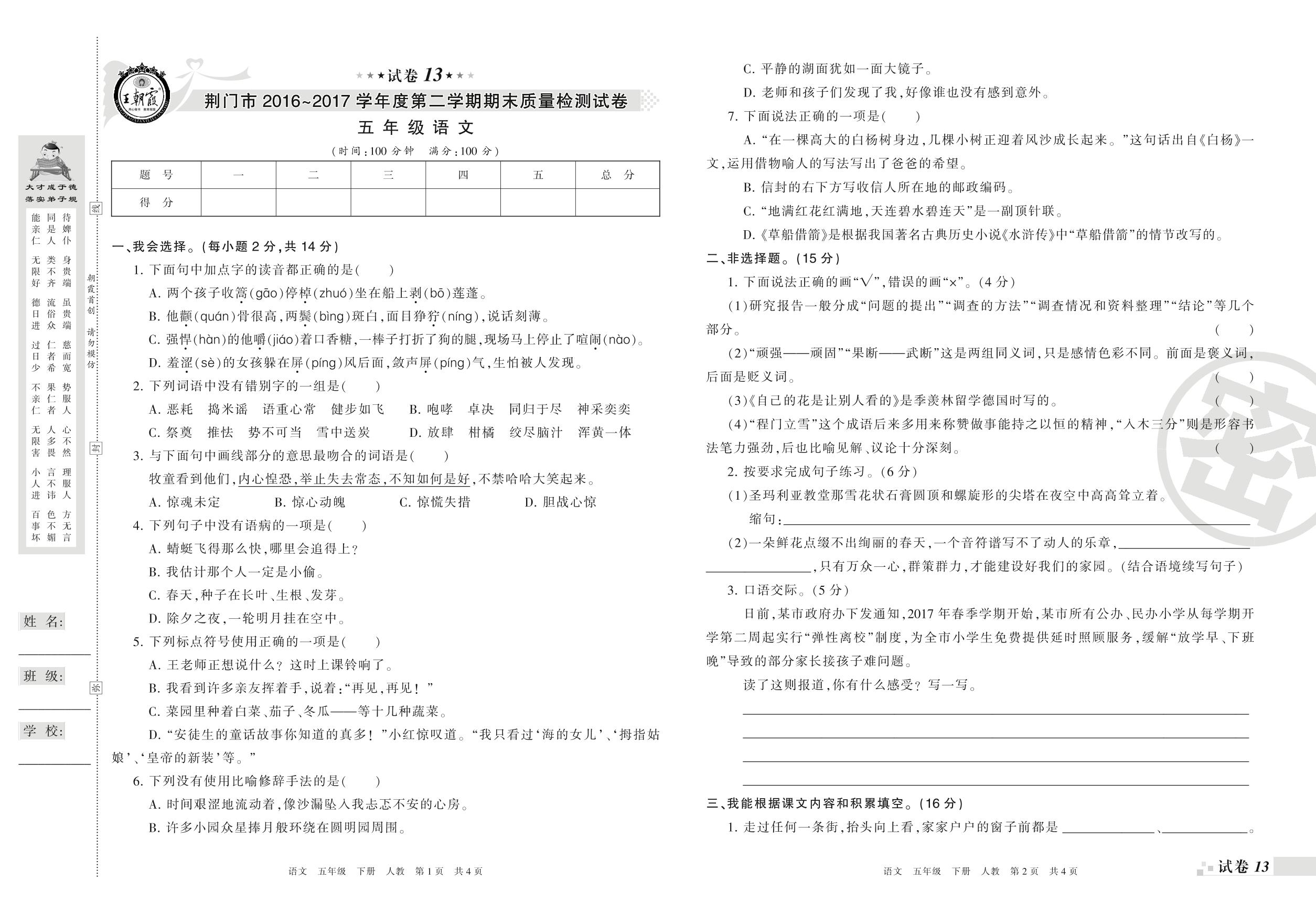 2016-2017学年第二学期荆门市五年级语文试卷(人教版)【13】
