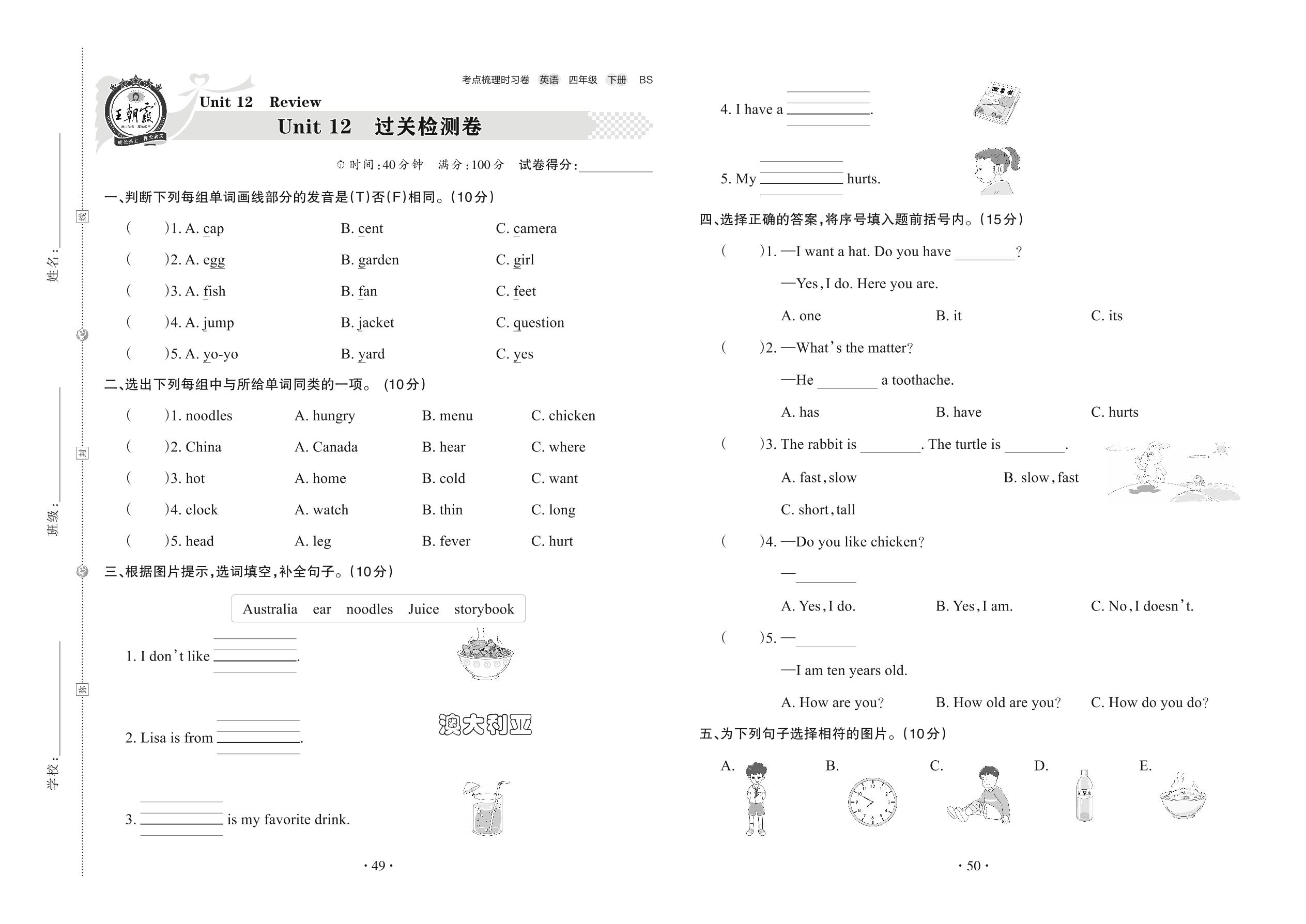 2022下册四年级英语北师版 Unit 12 过关检测卷