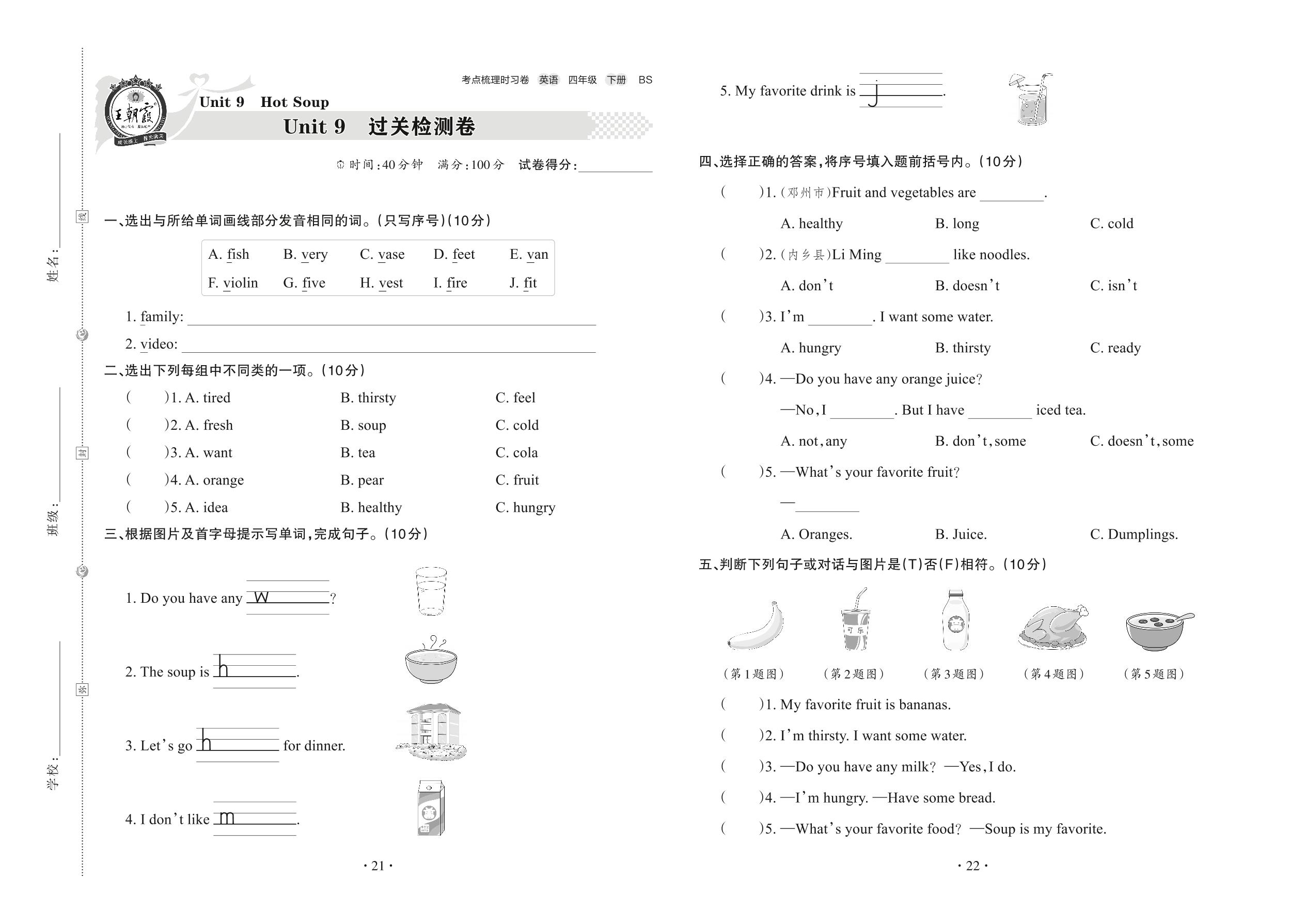 2022下册四年级英语北师版 Unit 9 过关检测卷