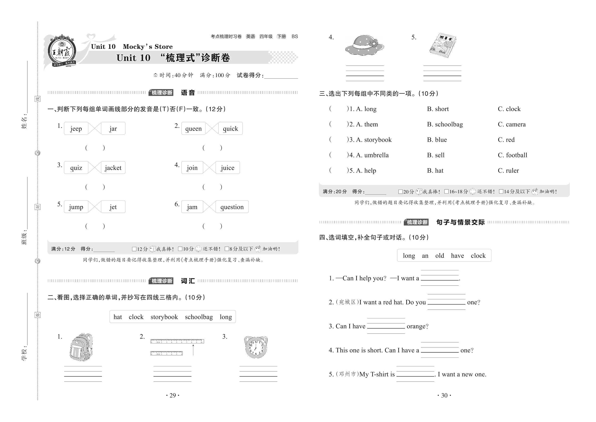 2022下册四年级英语北师版 Unit 10 “梳理式”诊断卷