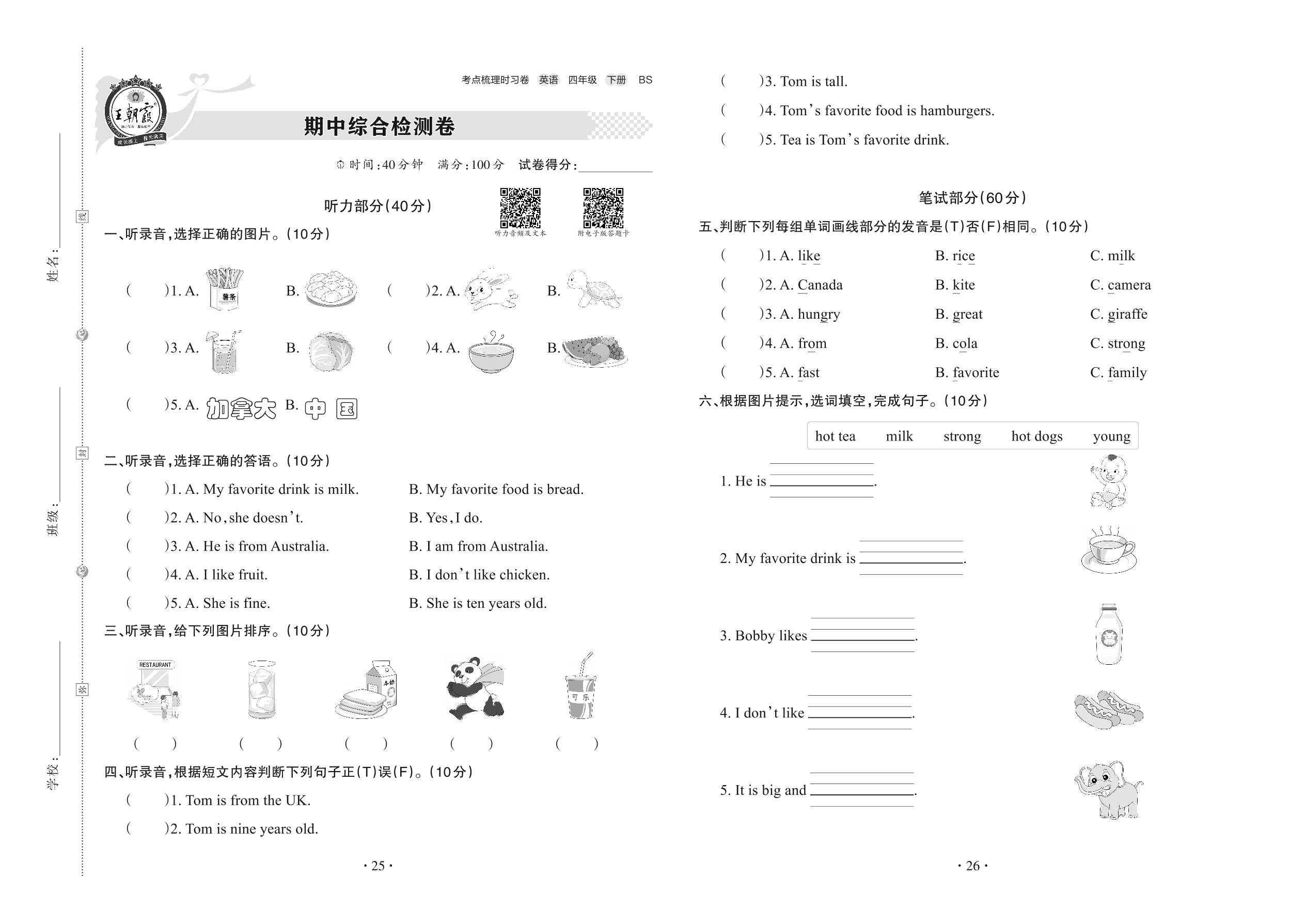 四年级英语北师版下册期中卷