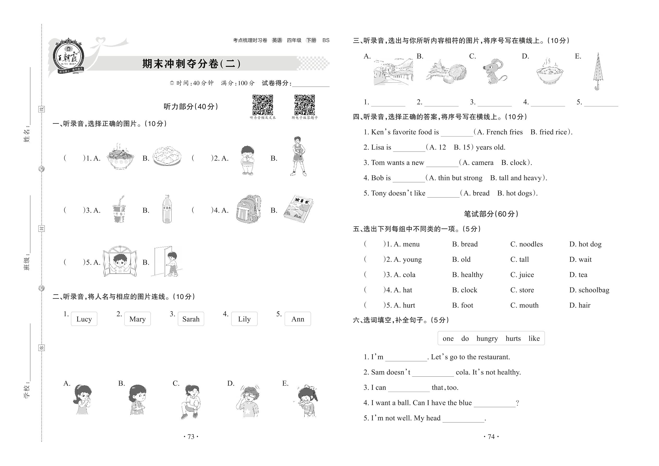 2022下册四年级英语北师版 期末冲刺夺分卷(二)