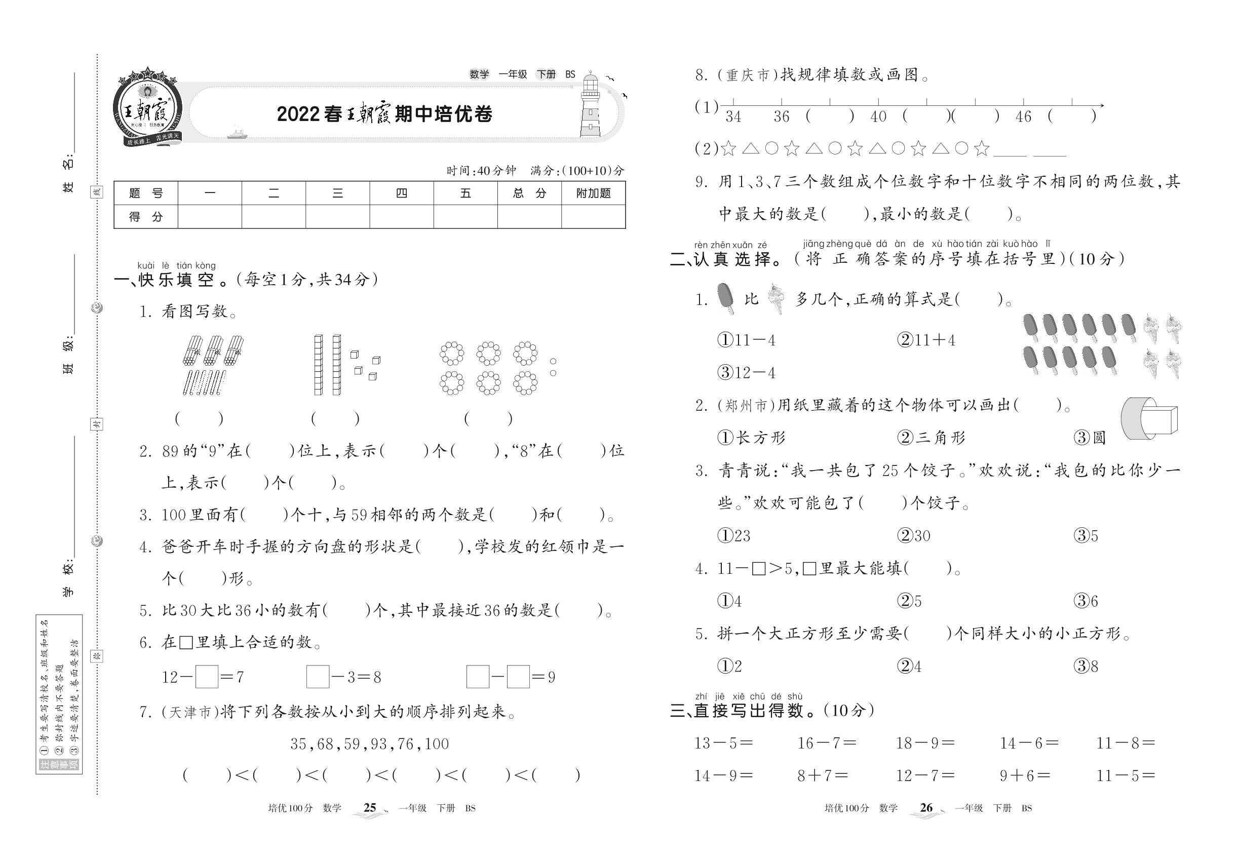 2022下册一年级数学北师版 王朝霞期中培优卷