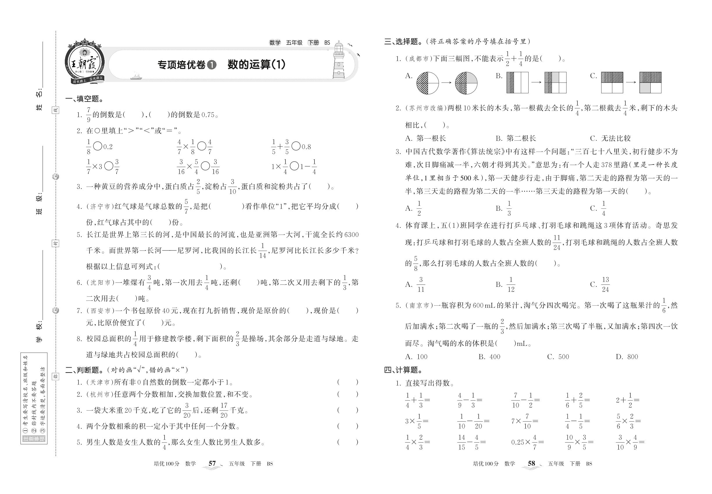 2022下册五年级数学北师版 专项培优卷1 数的运算(1)