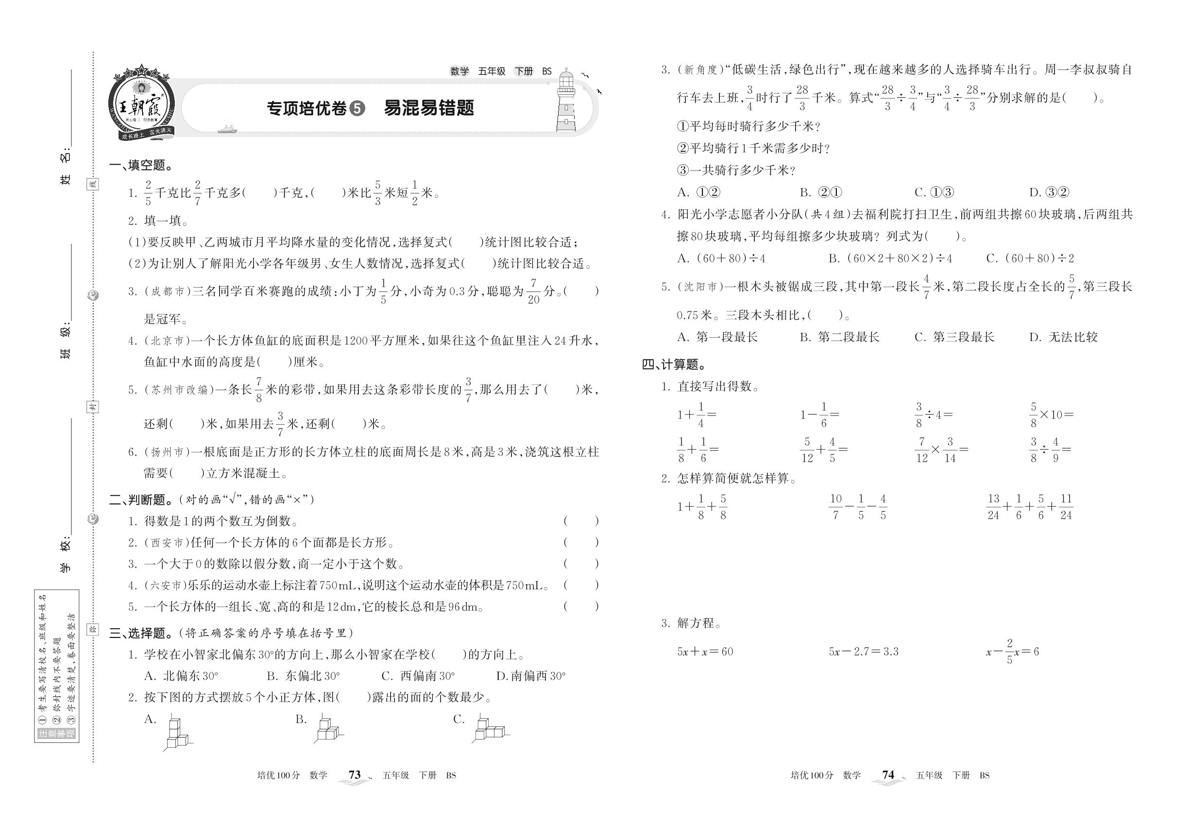 2022下册五年级数学北师版 专项培优卷5 易混易错题
