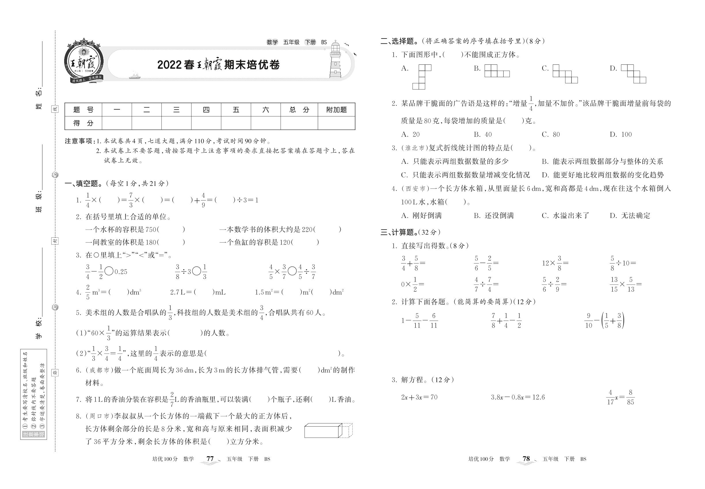 2022下册五年级数学北师版 王朝霞期末培优卷