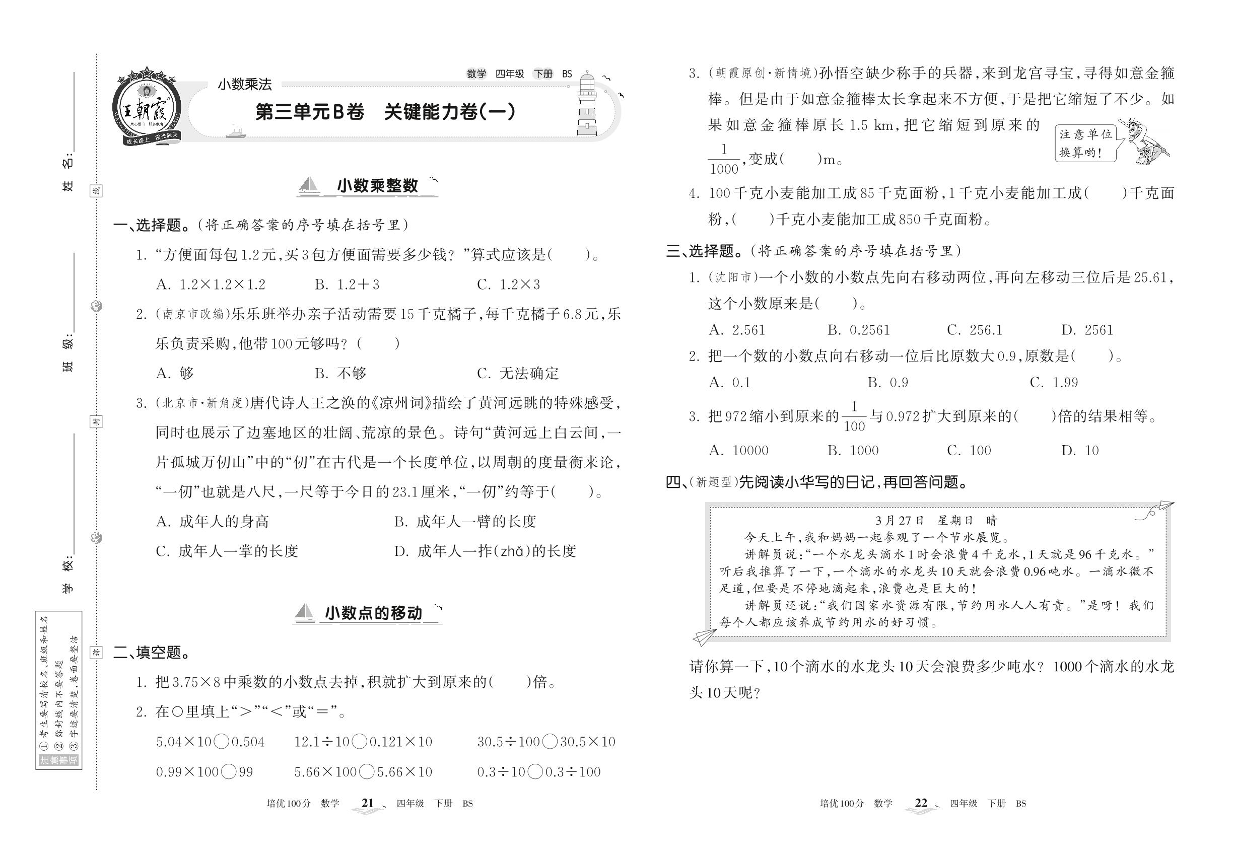 2022下册四年级数学北师版 第三单元B卷 关键能力卷(一)