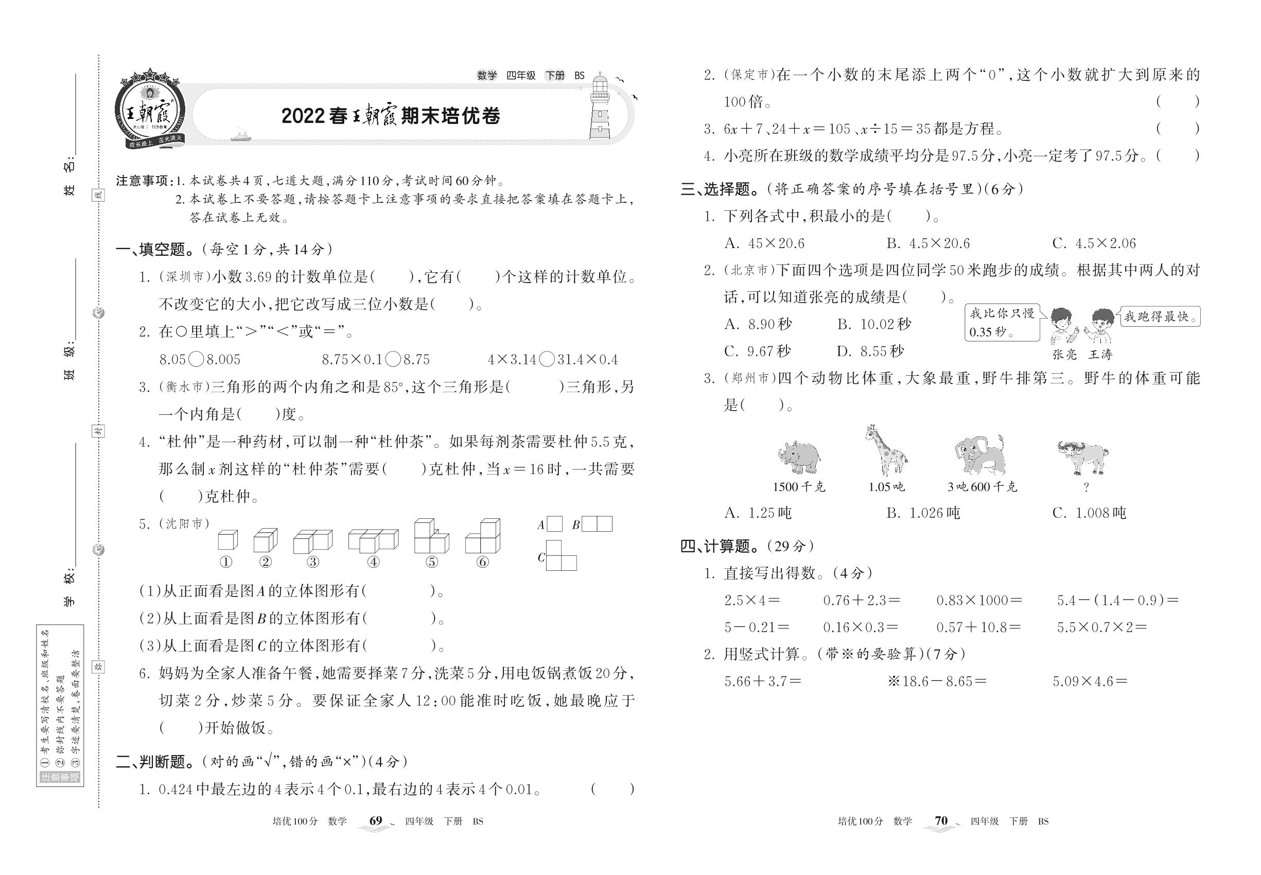 2022下册四年级数学北师版 王朝霞期末培优卷