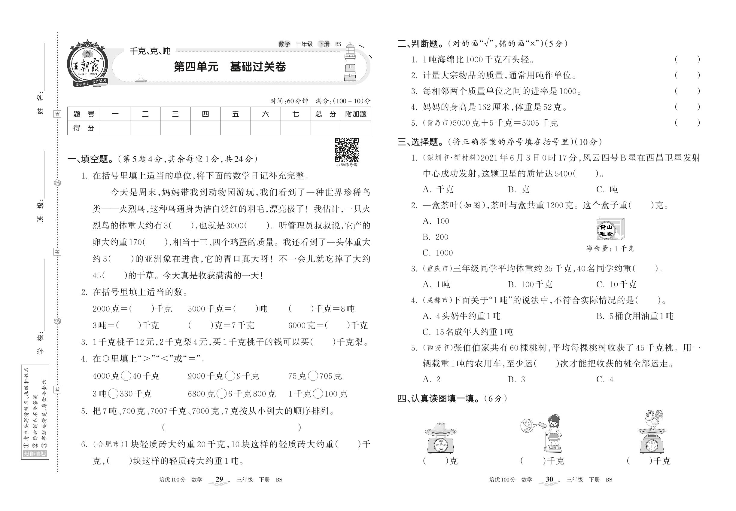 三年级数学北师版下册单元卷