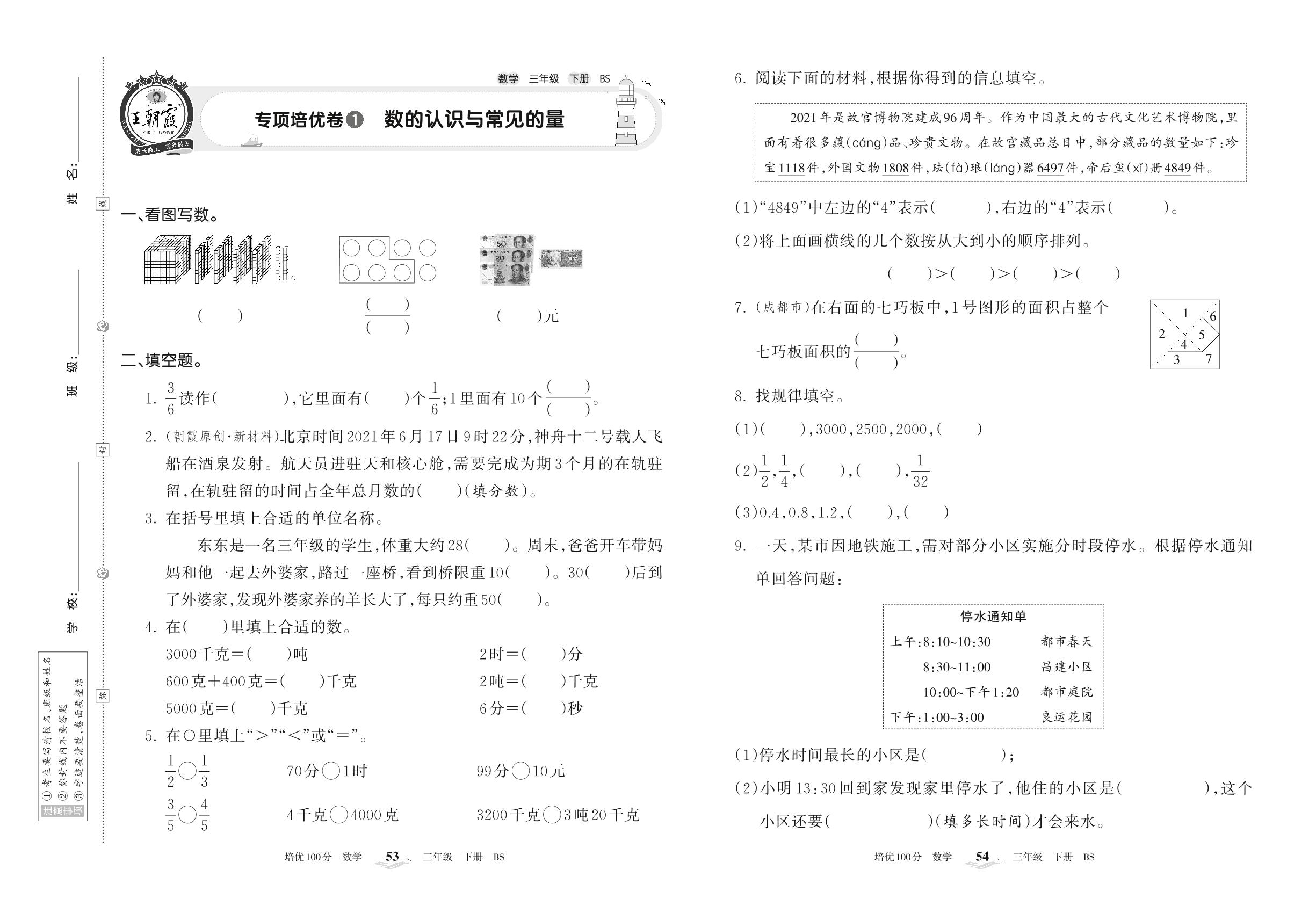 2022下册三年级数学北师版 专项培优卷1 数的认识与常见的量