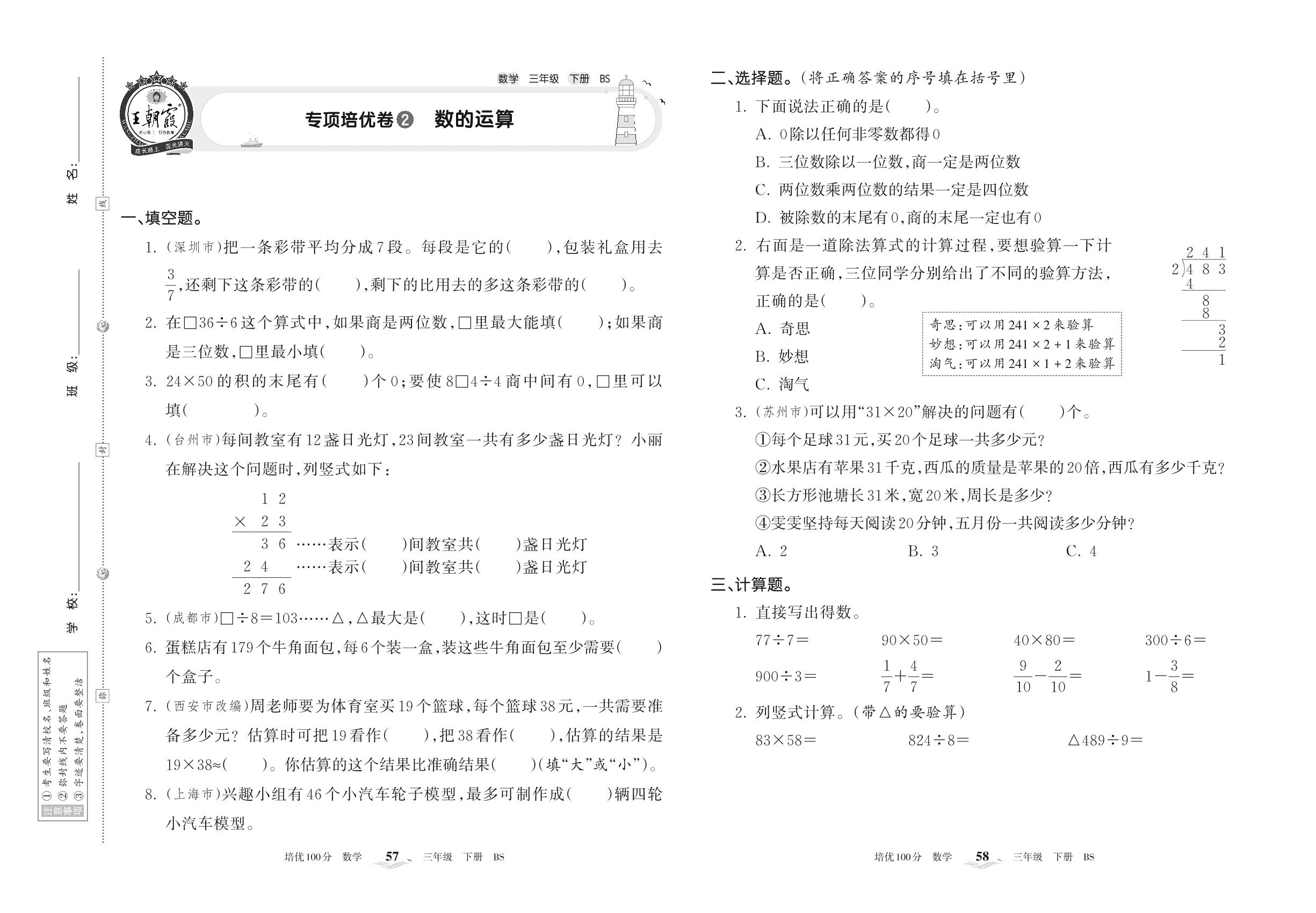 2022下册三年级数学北师版 专项培优卷2 数的运算