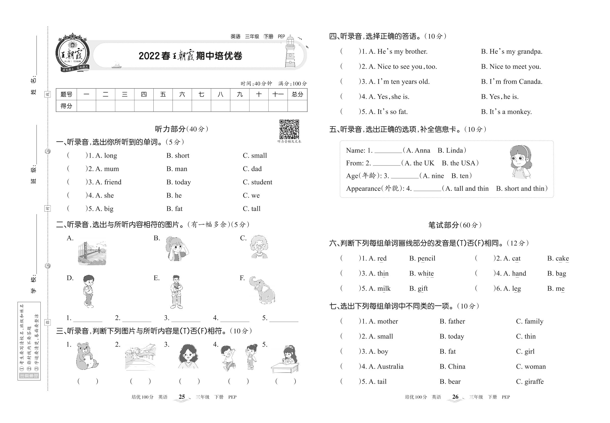 2022下册三年级英语人教PEP版 王朝霞期中培优卷