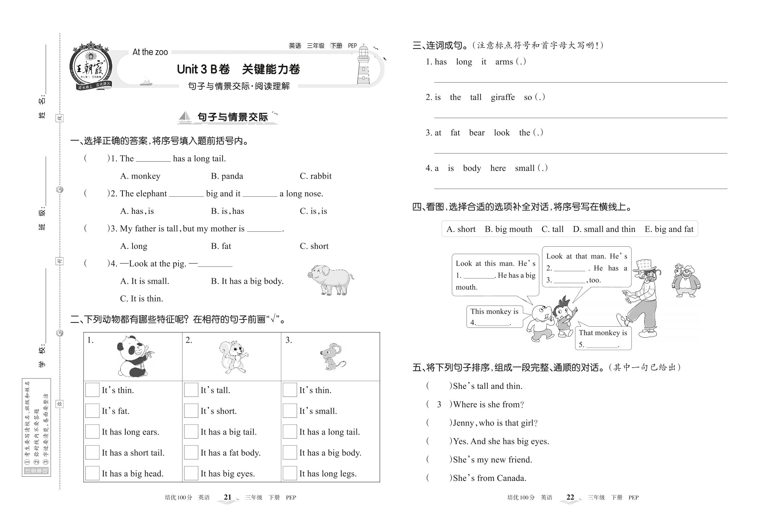 2022下册三年级英语人教PEP版 Unit 3 B卷 关键能力卷