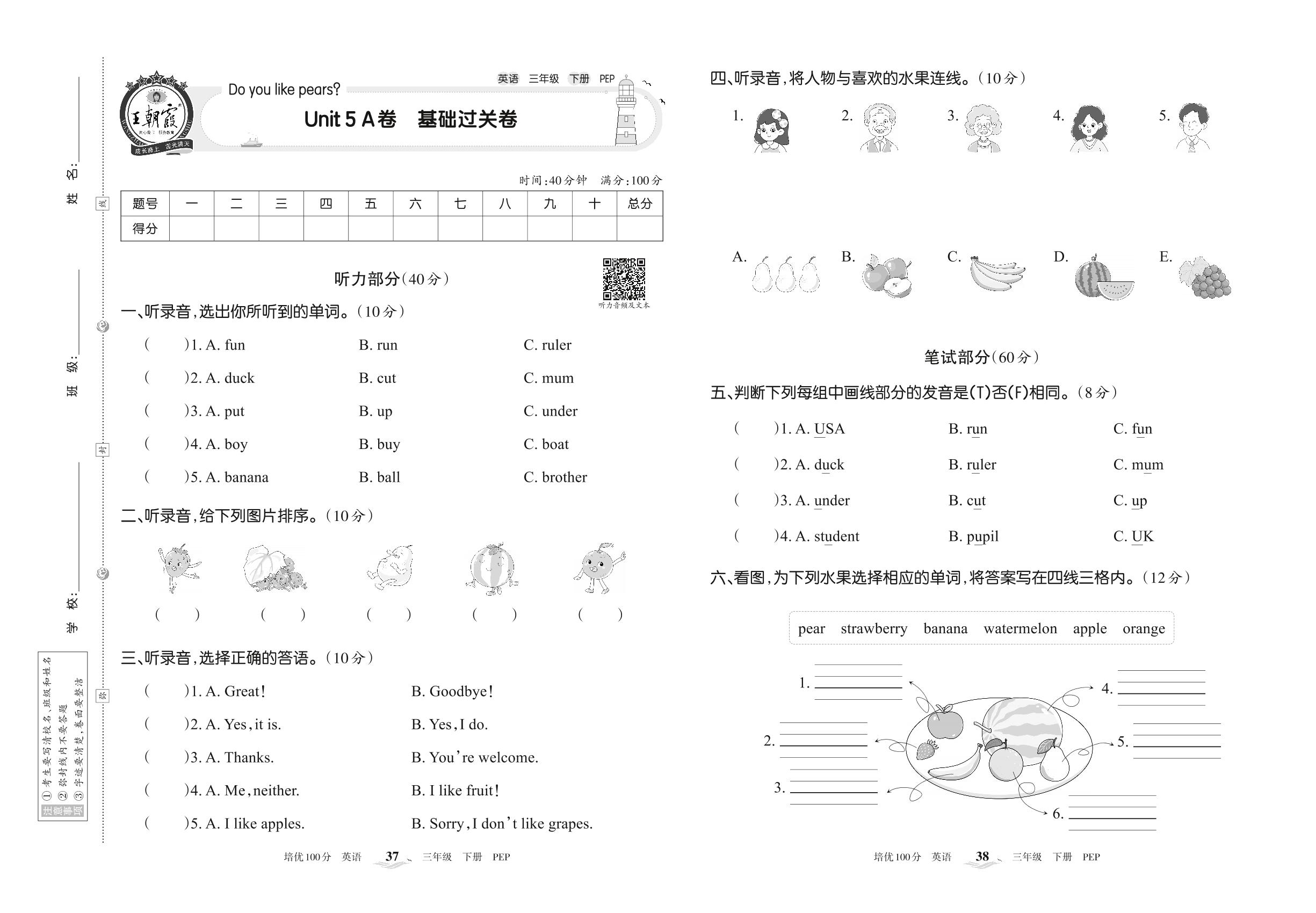 三年级英语人教PEP版(三起始)下册单元卷