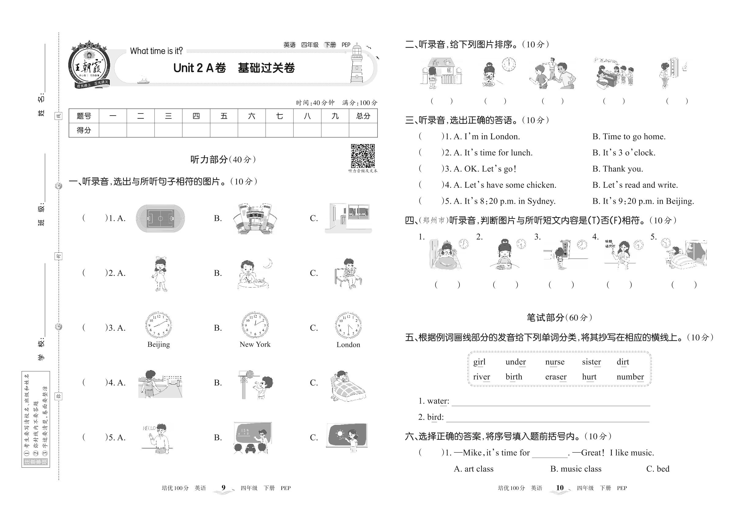 2022下册四年级英语人教PEP版 Unit 2 A卷 基础过关卷
