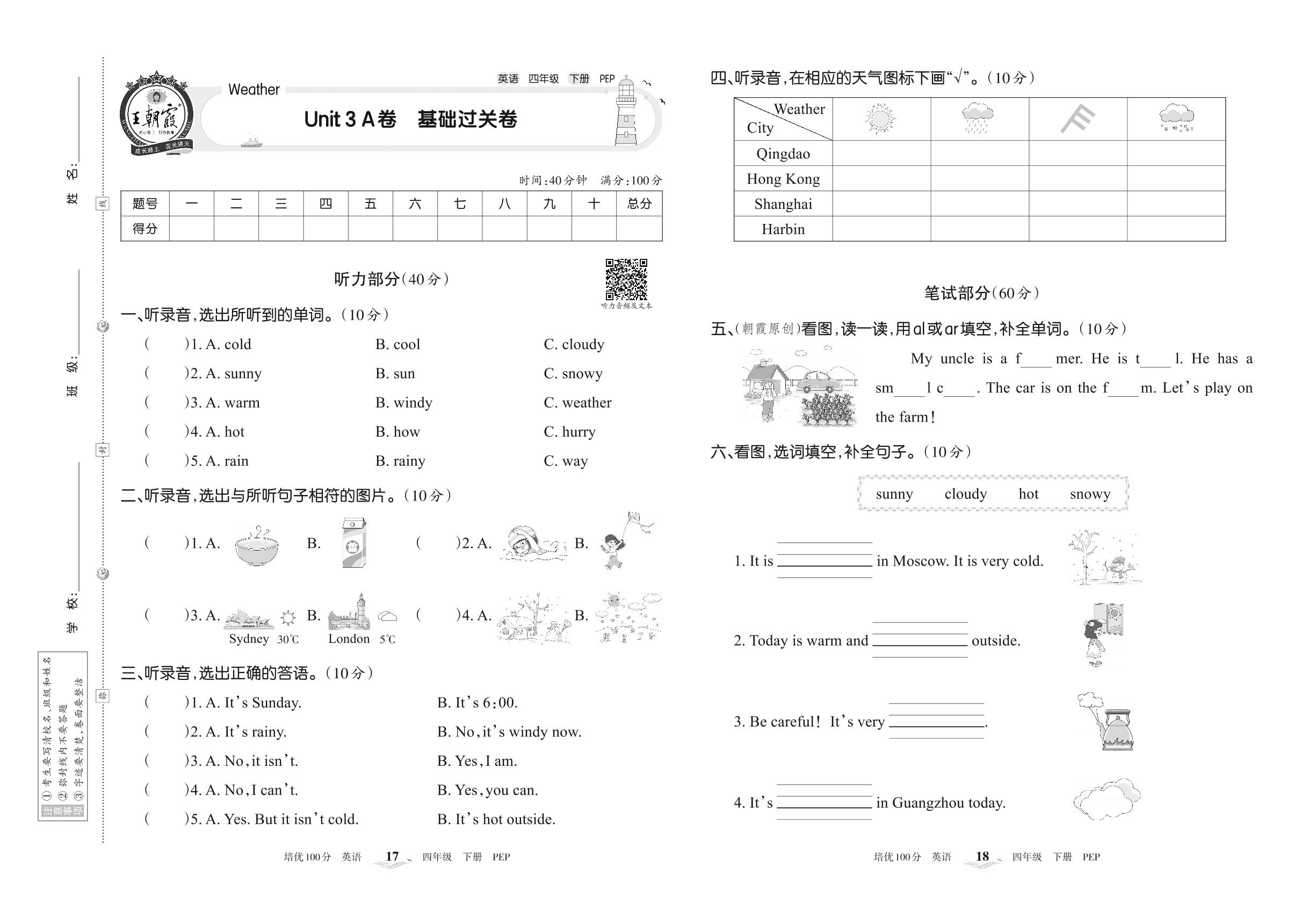 四年级英语人教PEP版(三起始)下册单元卷