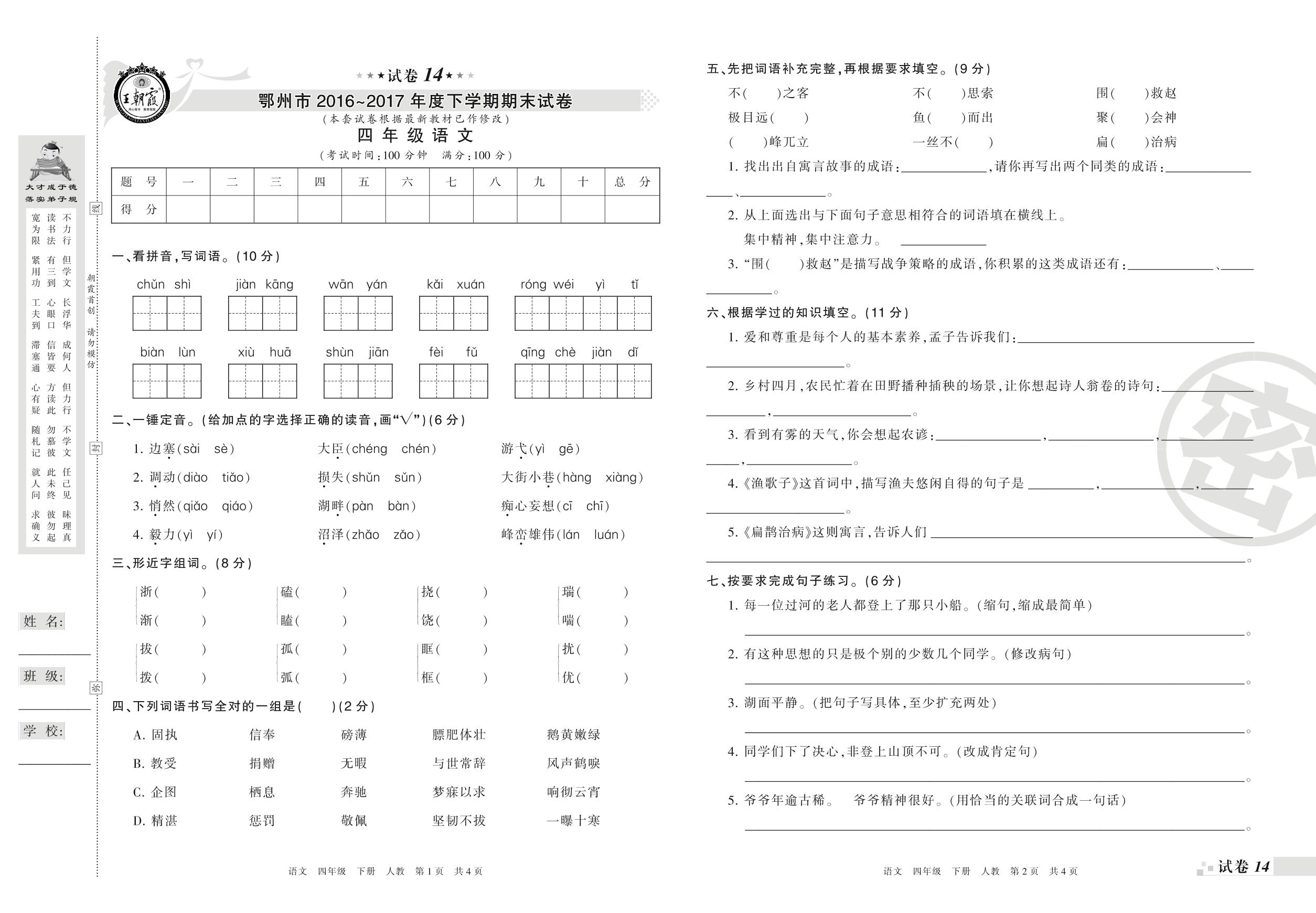2016-2017学年第二学期鄂州市四年级语文试卷(人教版)_R210801225507【14】