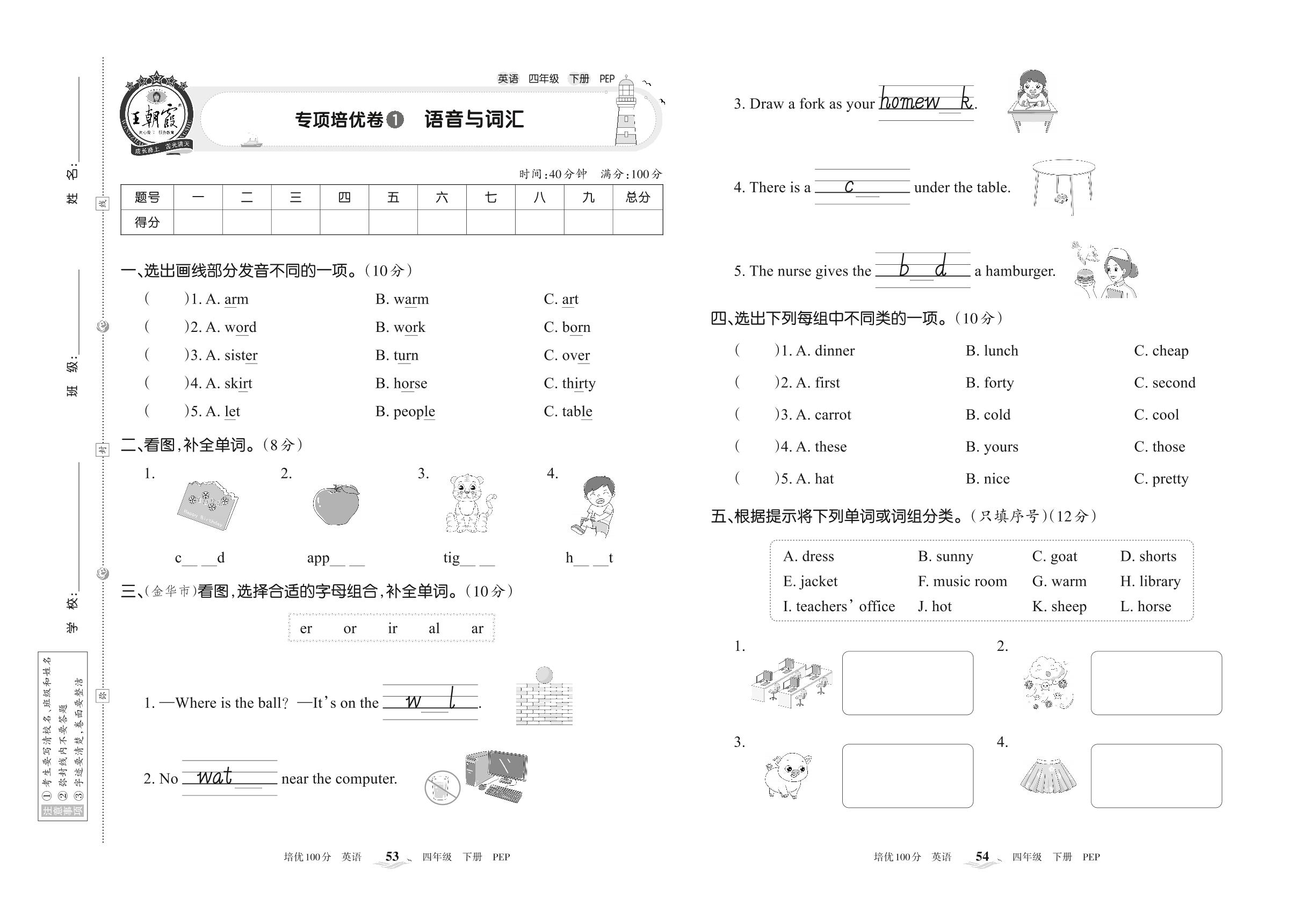 2022下册四年级英语人教PEP版 专项培优卷1 语音与词汇