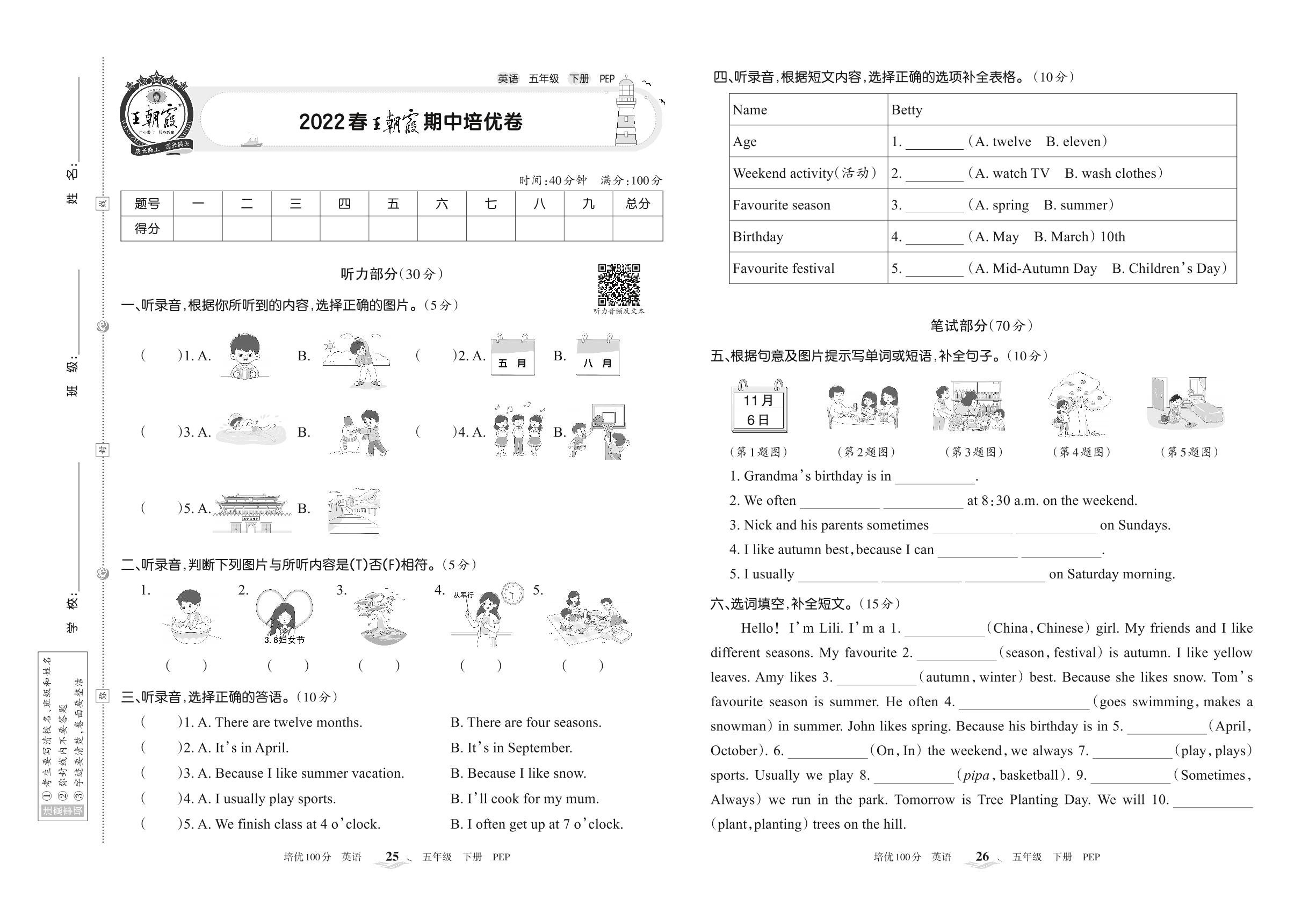 2022下册五年级英语人教PEP版 王朝霞期中培优卷
