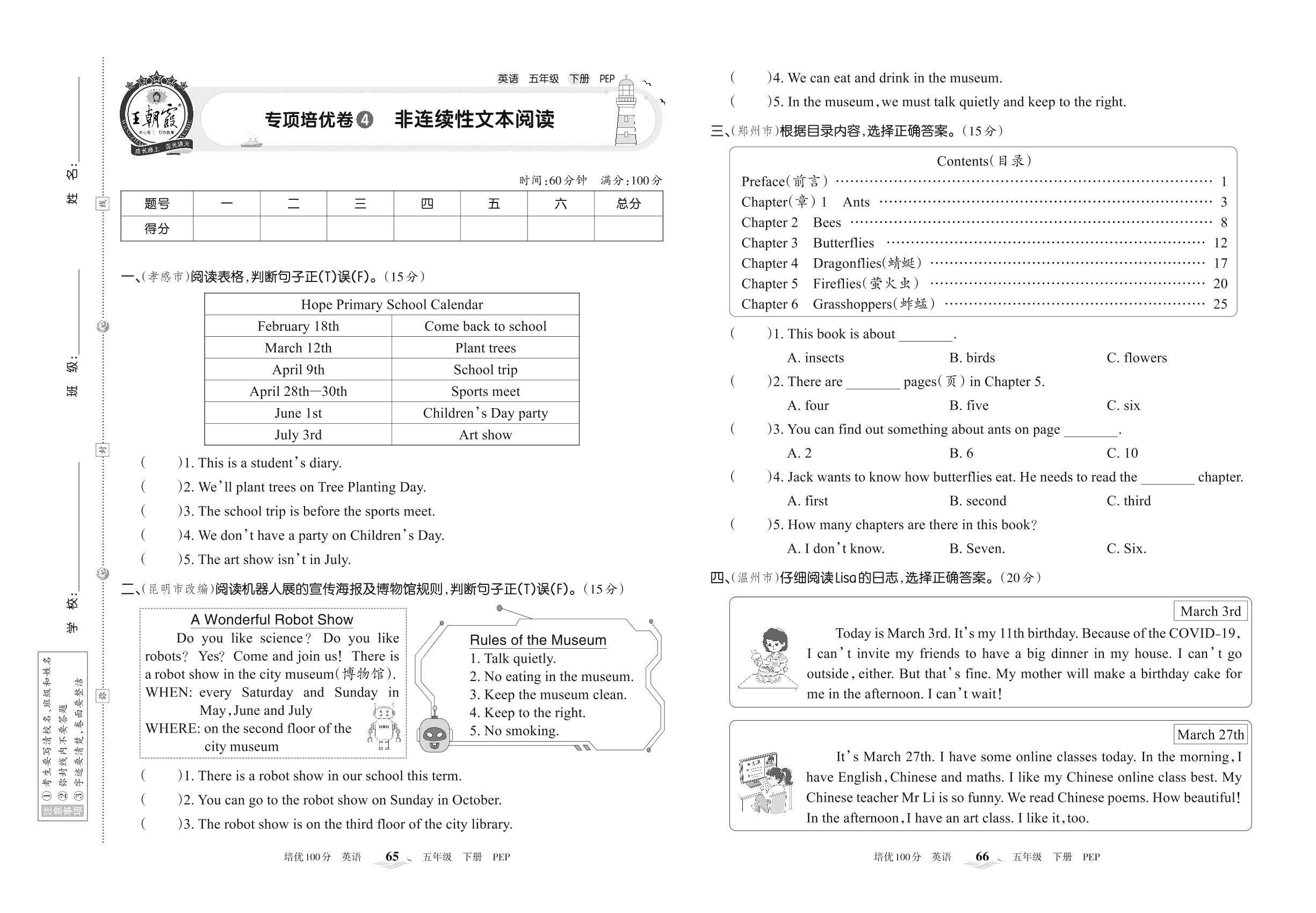 2022下册五年级英语人教PEP版 专项培优卷4 非连续性文本阅读