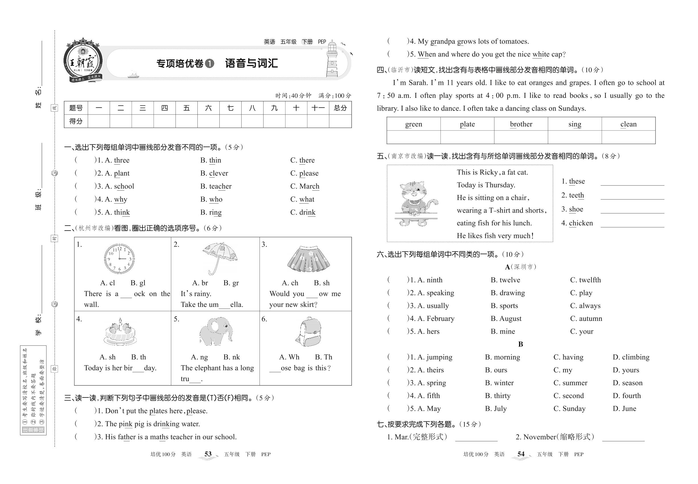 2022下册五年级英语人教PEP版 专项培优卷1 语音与词汇